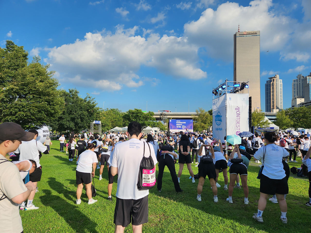 출발 시간인 저녁 6시 전에는 대회 스폰서들 부스에서 제품을 체험할 수 있는 프로그램이나 기념품 행사가 진행되었고 무대 앞에서도 진행자가 쉴 새 없이 참가자들을 앞으로 불러내어 소감, 각오 등을 들으면서 시간을 알차게 채우고 있었다. 선크림도 충분히 바르고 몸도 풀면서 주위를 둘러보니 SNS에 올릴 사진을 찍느라 여기저기서 사람들이 모여있었다. 나도 조심스럽게 혼자 사진을 찍었는데 찍고 보니 뜨거운 햇빛 때문에 급피곤해진 모습이라서 실망만 했다. 그냥 주변 풍경이나 찍기로 하고 출발선 근처로 슬금슬금 움직였다.