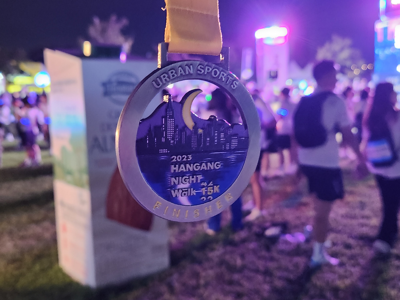 체크포인트 쪽에서 CP뱃지를 받고 반환점을 돌았다. 그때쯤 되니 시원한 바람이 불기 시작했다. 여름 저녁인데도 이런 바람이 부는 것에 감사함을 느꼈다. 덥고 습한 바람이었으면 걷기 답답했을 텐데 그날만 그랬던 것인지 땀을 식힐 정도의 바람이 불어 속도에 박차를 가할 수 있었다. 정신없이 걷다 보니 2시간 40분이 지나 시작점으로 돌아와 완주를 할 수 있었다. 완주하고 스태프 분들이 주는 메달과 기념품을 받고 나오면 무대 쪽에서 완주자들을 축하하기 위한 행사가 진행이 되는데 나는 뒤도 돌아보지 않고 지하철 역으로 부지런히 움직였다. 내가 생각해도 여러가지 풍성하게 준비되어 있는 행사인데 정말 걷기만 쏙 하고 온 것이 어이없긴 했지만 그에 상응하는 많은 것을 얻어왔다고 생각한다. 앞서서 말했던 완주 후의 성취감, 그리고 무엇이든지 할 수 있다는 자신감. 이 두 가지는 나에게 앞으로의 미래를 준비할 때 필요한 동기부여의 원동력이 되는 것을 알기에 조금 쳐지고 있는 요즘, 이 경험이 꼭 필요했다.