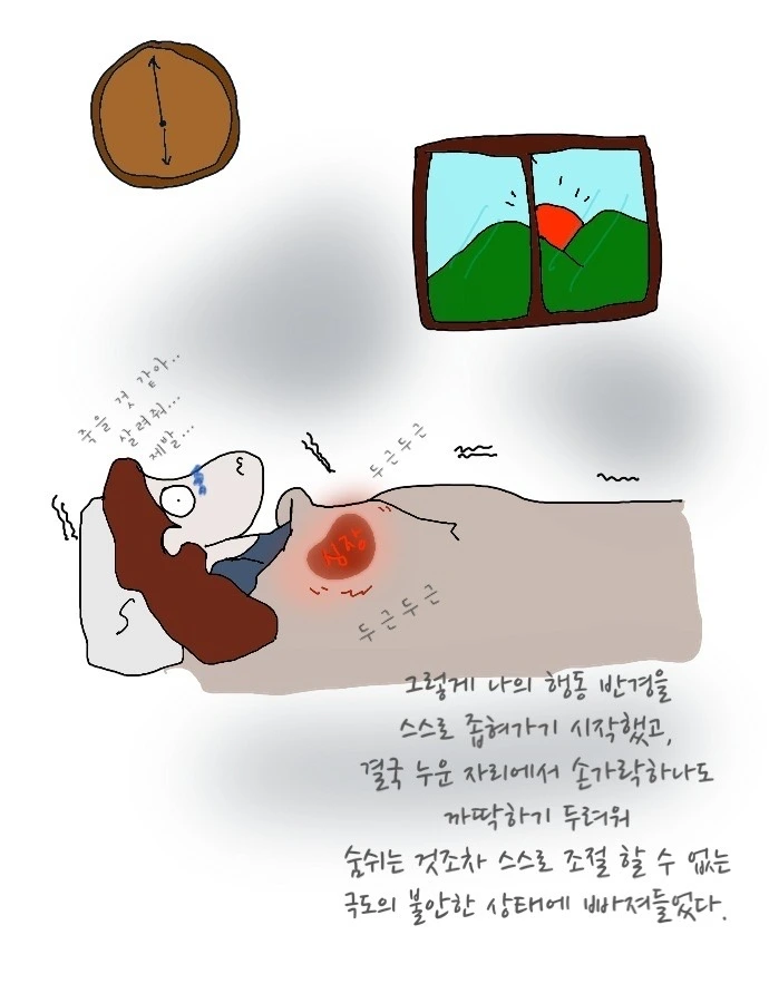 밤새 30분 간격으로 잠이 깼었던 나는 6시에 나의 신체화 증상에 강제 기상을 당한 뒤 원인모를 공포감. 죽을 것 같은 느낌 때문에 누운 자리에서 얼굴 근육하나 못 움직이고 겨우 남편을 불렀다.
