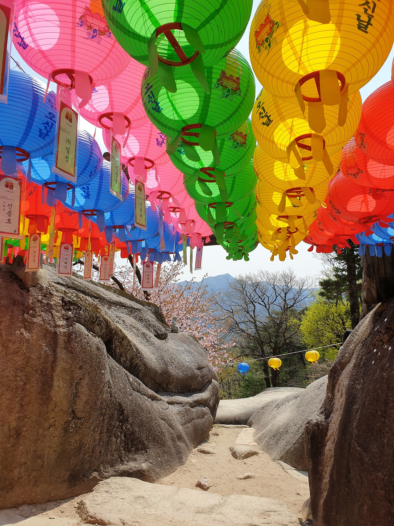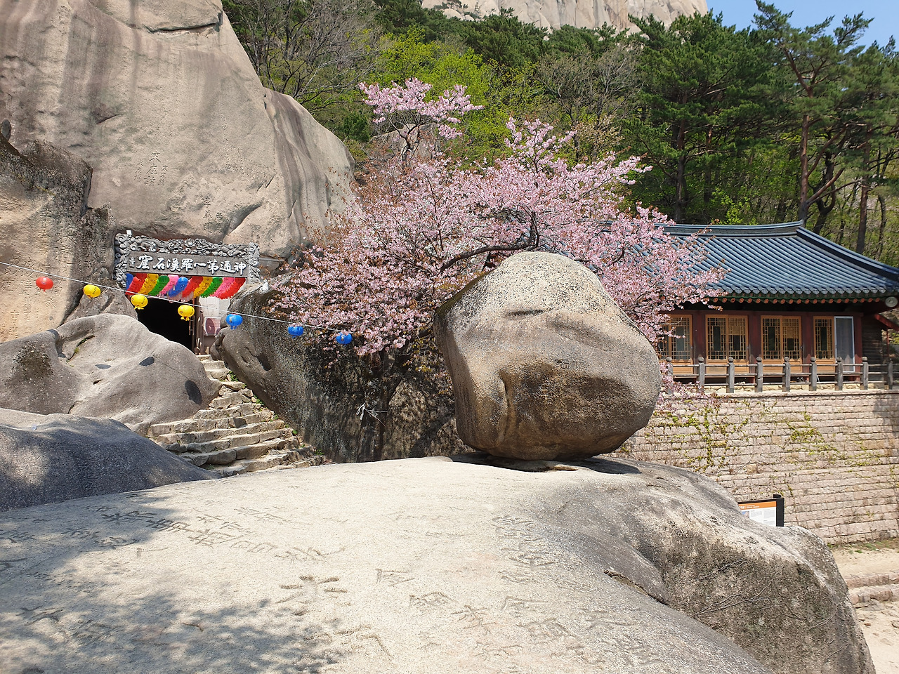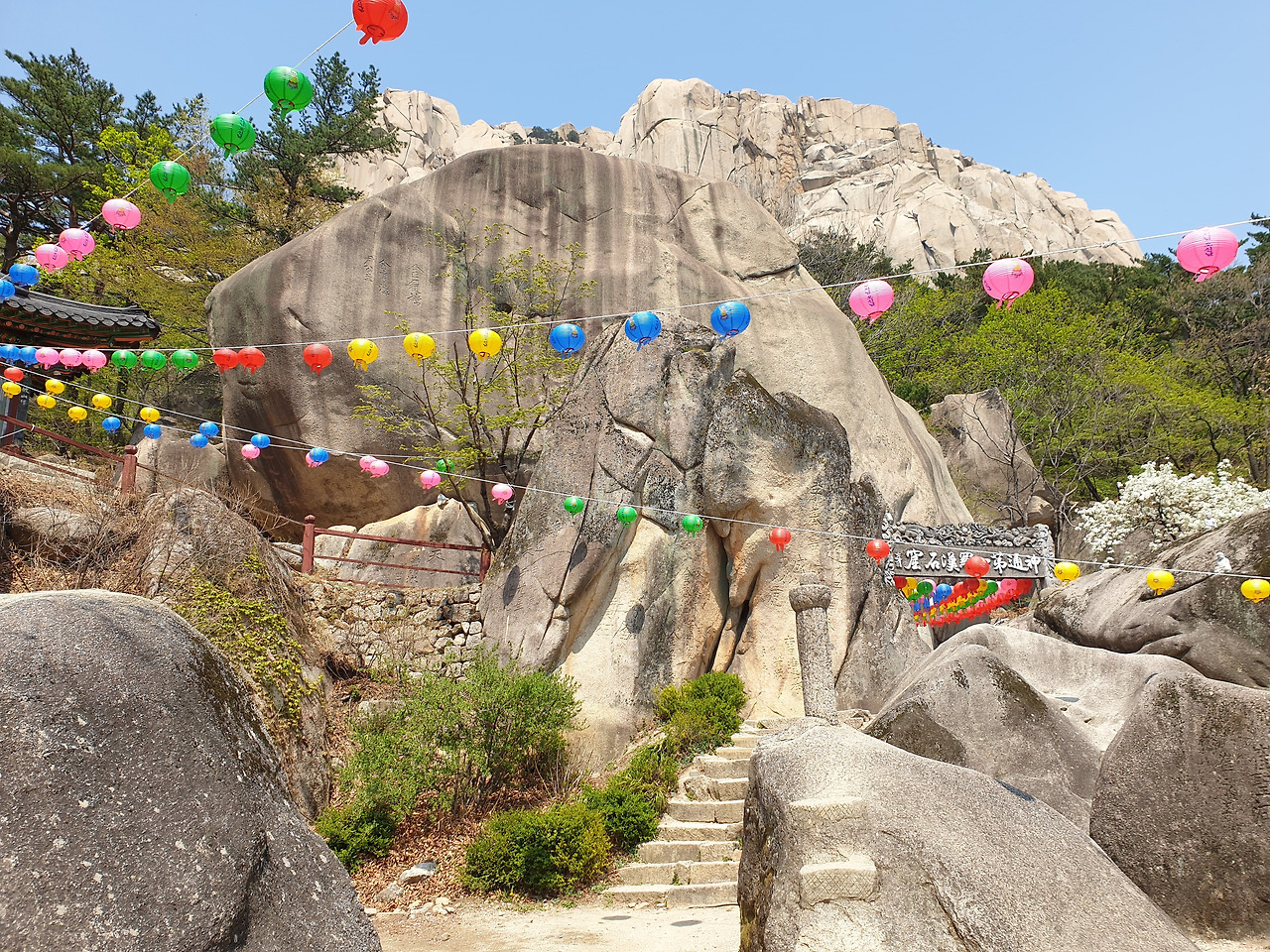 울산바위에 오르기 전 만난 흔들바위는 잠시 쉬어가기 좋은 곳이다. 하지만, 아껴두고 정상을 찍고 내려와 쉬고 싶었다. 지금 앉으면 울산바위까지는 갈 수가 없을 거 같아 마음을 독하게 먹었다. 바위 옆에는 석굴 '계조암'이 있다. 벚꽃과 함께 연등꽃이 알록달록 펴 산속을 포근히 감싸고 있었다.