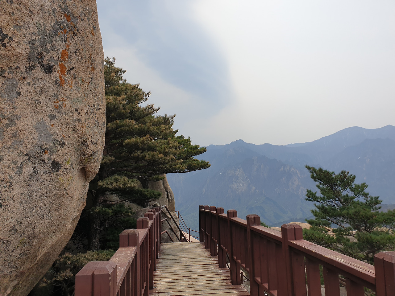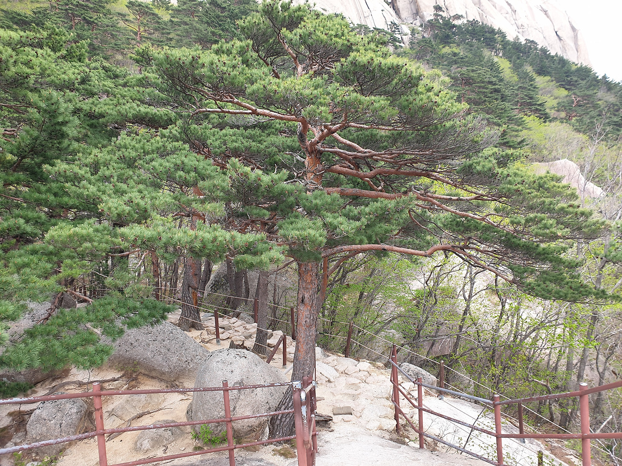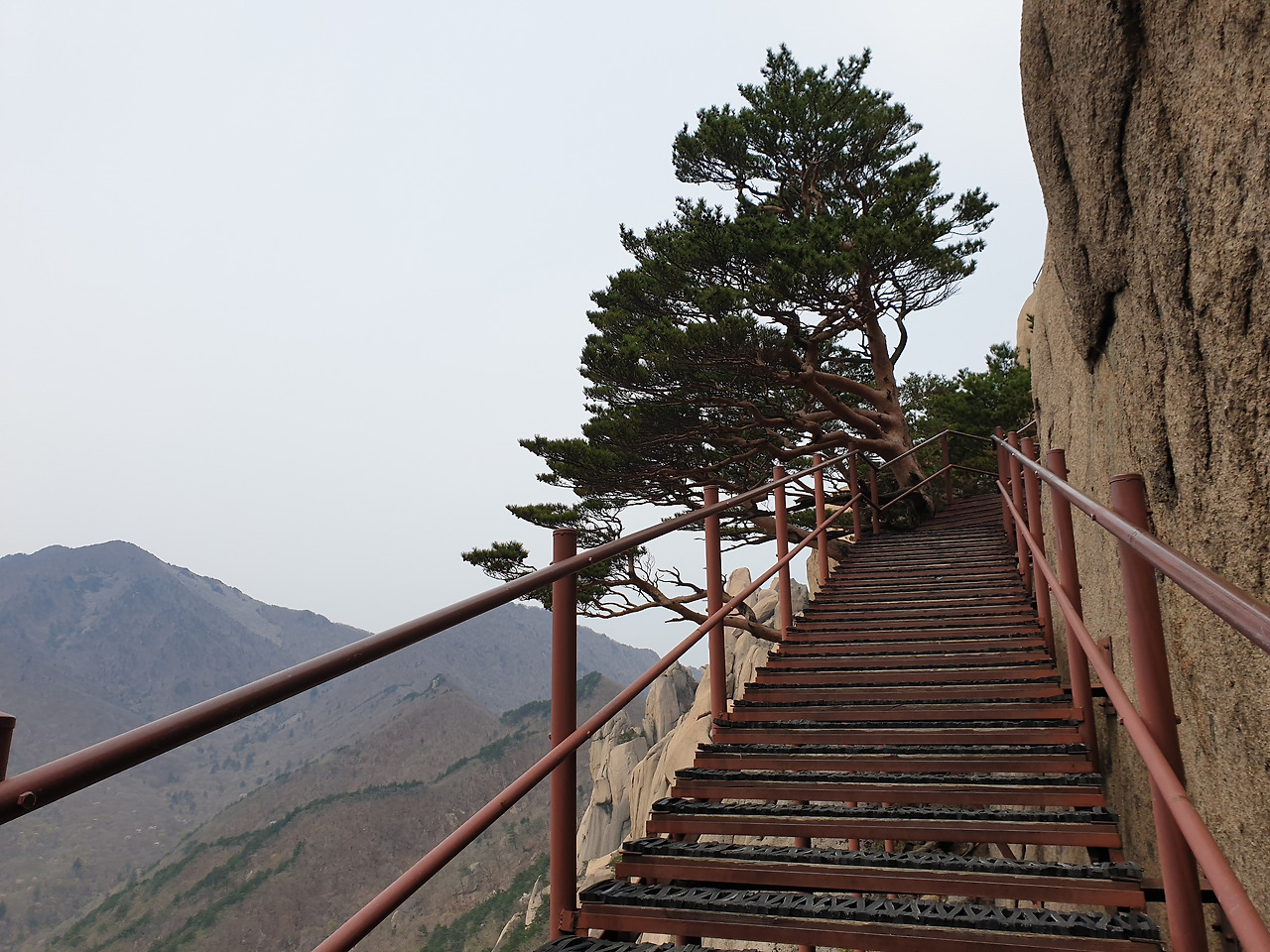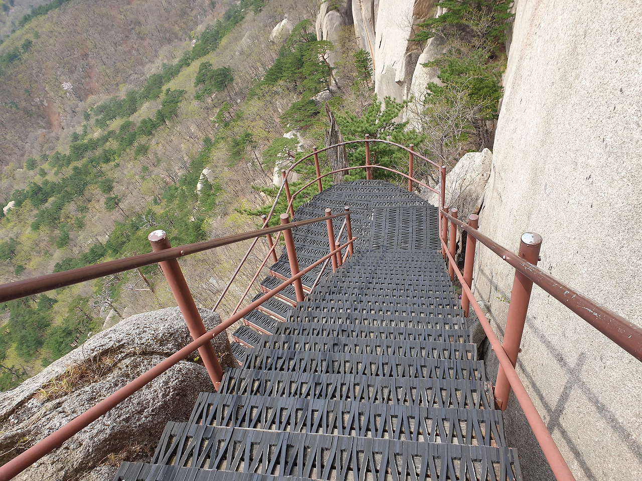 이제 정상을 향한 마지막 산행의 시작이다. 중간에 평지와 오름이 반복되고 숨 고르기를 하며 20대에 맞 본 그 공포의 계단을 드디어 마주하게 된다. 그때는 친구들과 함께 이곳을 왔는데 이제는 혼자, 그것도 멈추지 않고 걸어왔다. 끝날 듯 끝나지 않는 계단을 지나다 보니 어느덧 저 멀리 정상이 보인다.