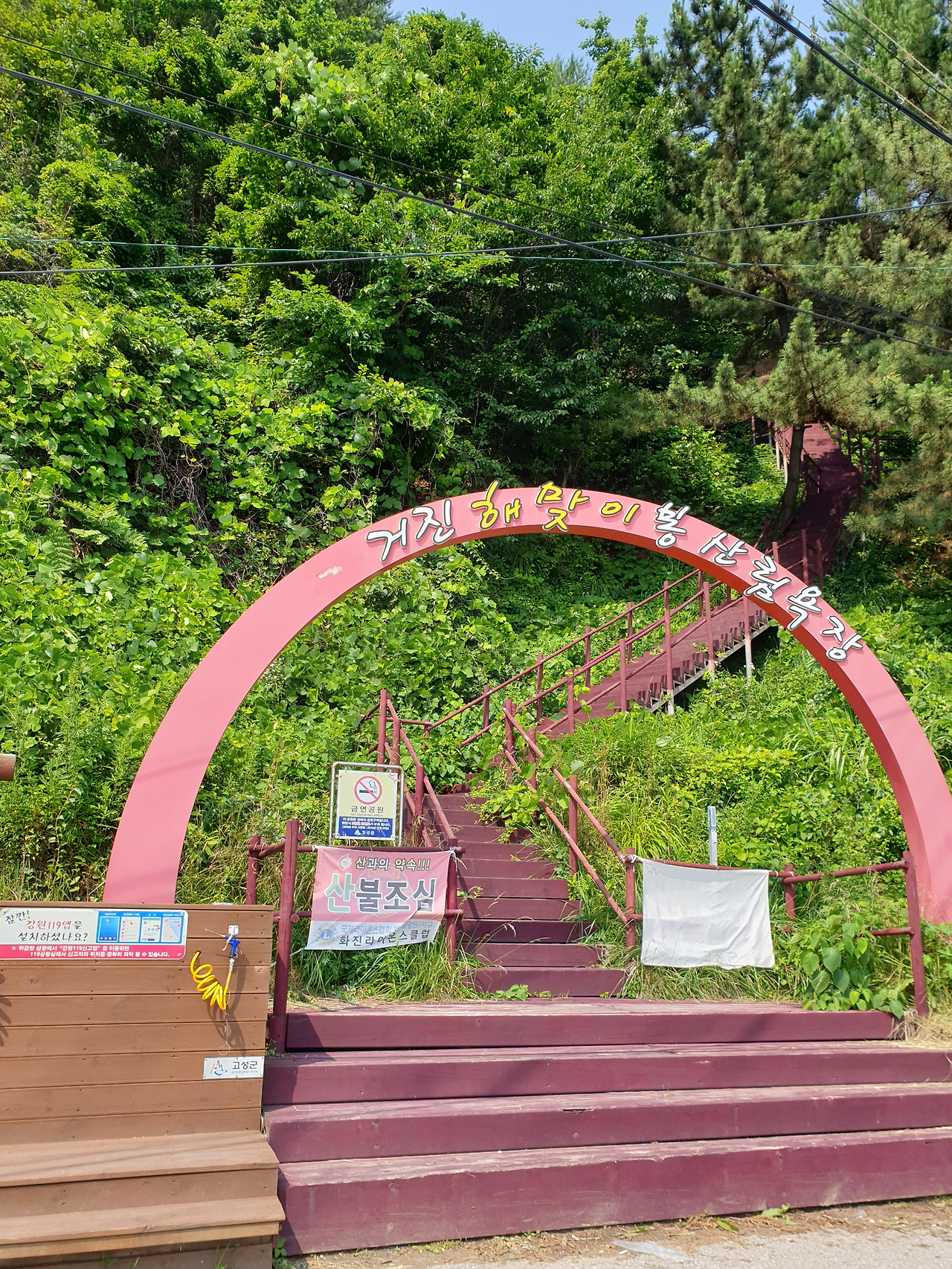 여기가 초입이 아니라면 계속 바다를 보고 싶었지만 저 멀리 보이는 빨간색으로 치장한 '산림욕장 가는 길'이 눈에 들어와 이내 발길을 옮겼다. 입구는 계단으로 성산일출봉 높이만큼 올라가야 한다. 계단을 다 오르니, 옆에 길이 또 있었다. 공원에서 올라오는 입구인가 싶었지만 그래도, 전망대를 덤으로 보고 왔으니 ‘계단쯤이야.’ 힘든 길은 참을 수 있다.
