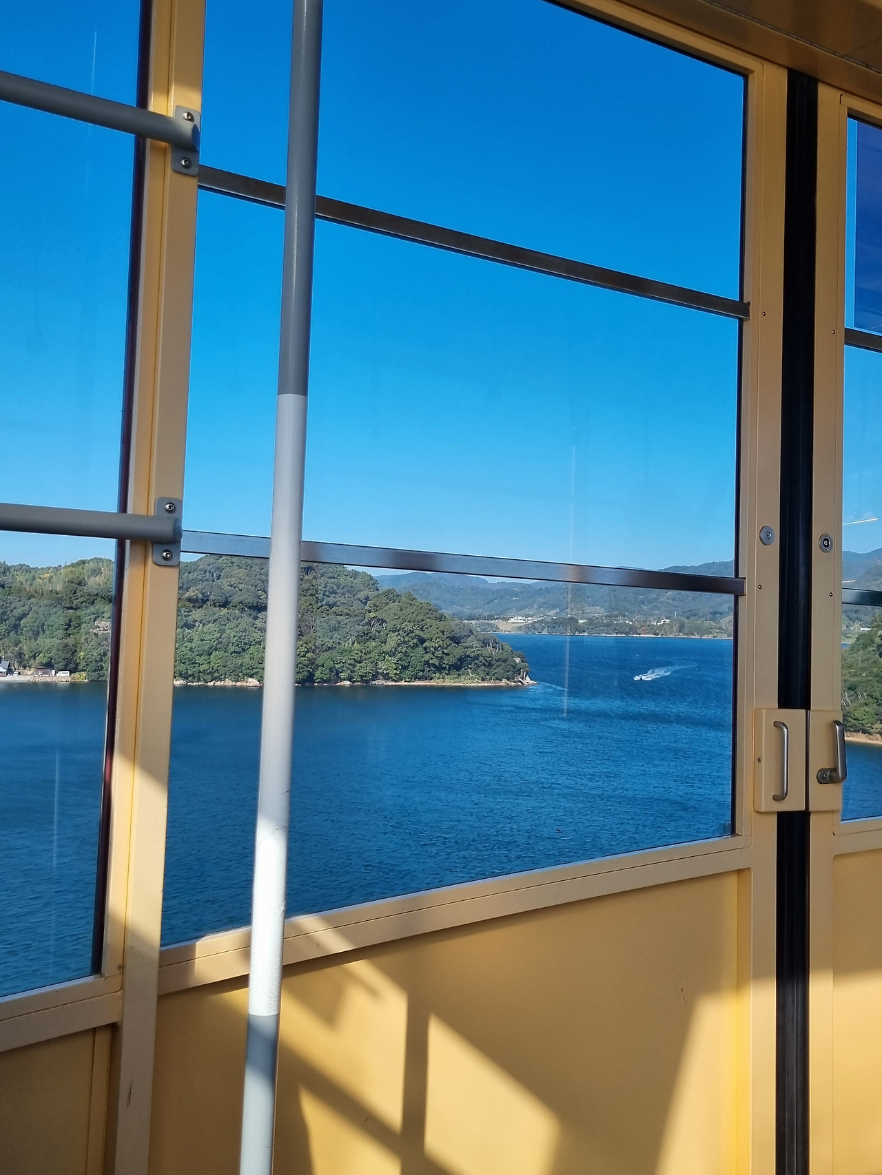 안에 나무 의자가 보였다. 앤틱이라 부르기에는 좀 촌스럽다. 1970년대를 연상할 만큼 세월의 무게가 느껴져 불현듯 의자의 나이도 궁금해졌다. 1960년 12월에 문을 연 로프웨이는 칸잔지역에서 오쿠사야마역을 잇는 723m 길이의 노선으로 엔슈철도에서 운영한다. 재밌는 건 '일본 최초로 호수를 가로지르는 로프웨이'라는 타이틀을 가지고 있다. 오랜 세월의 냄새는 그냥 풍기는 짬밥이 아니었다. 호기심으로 시작한 의자에 친근감이 생겼다. 요즘은 모든지 빨리 변하고 새로운 곳을 찾아다니기 바쁜데 이곳이야 말로 시간여행을 떠날 수 있지 않을까.
