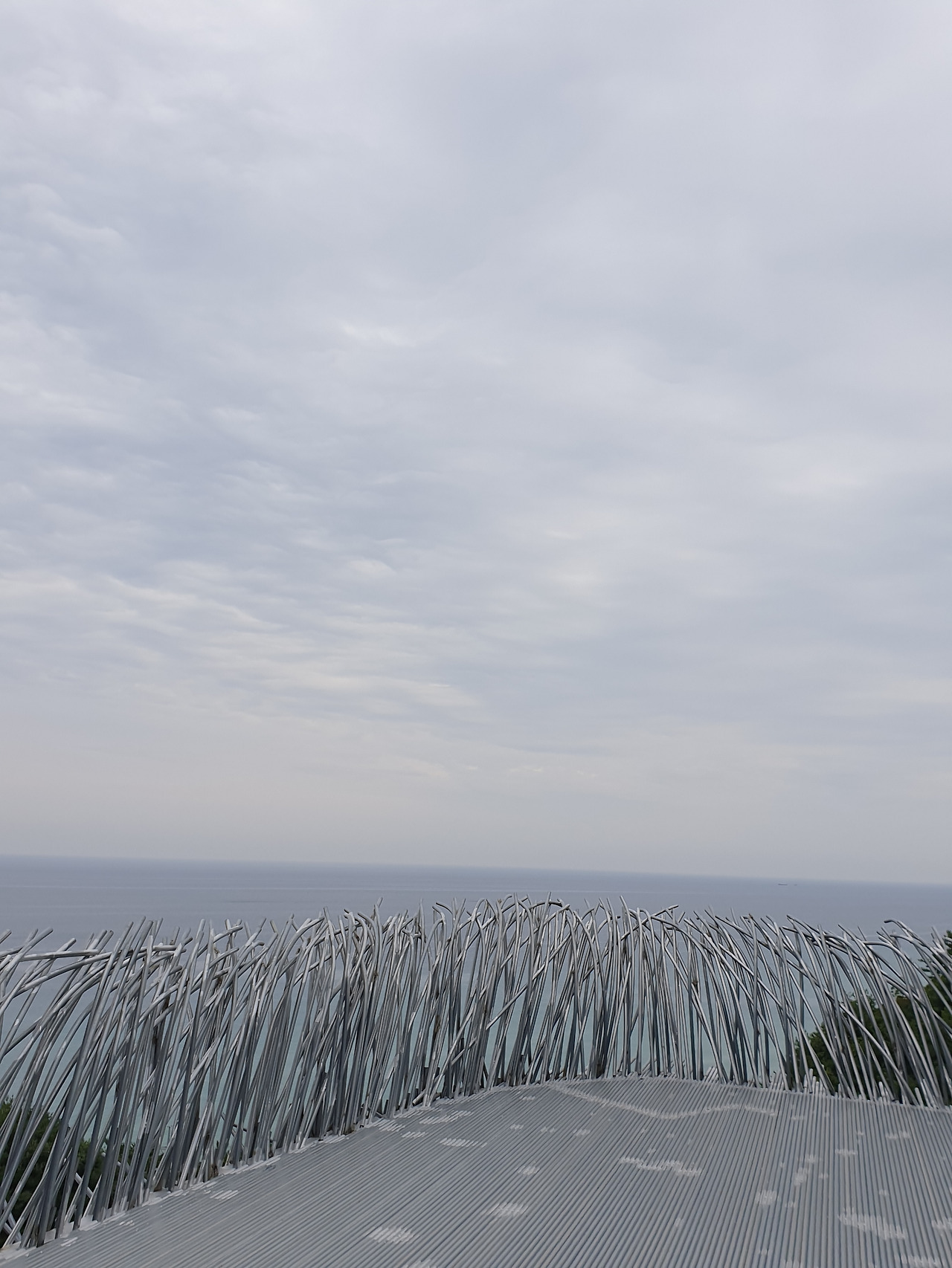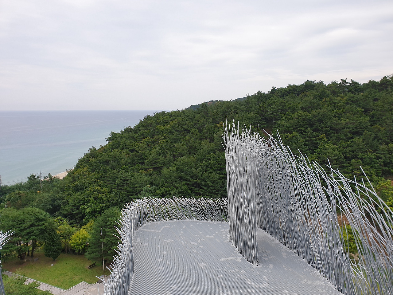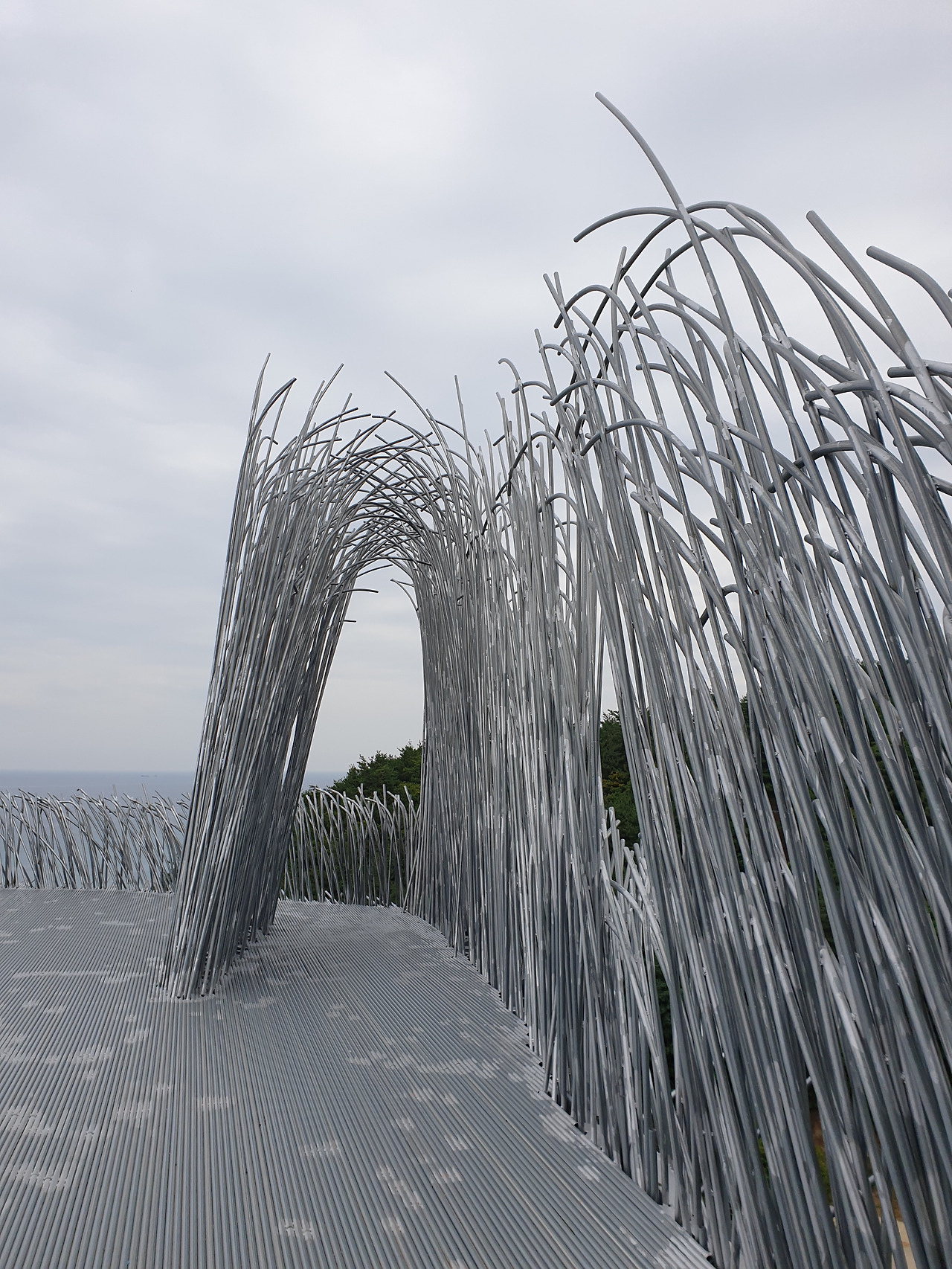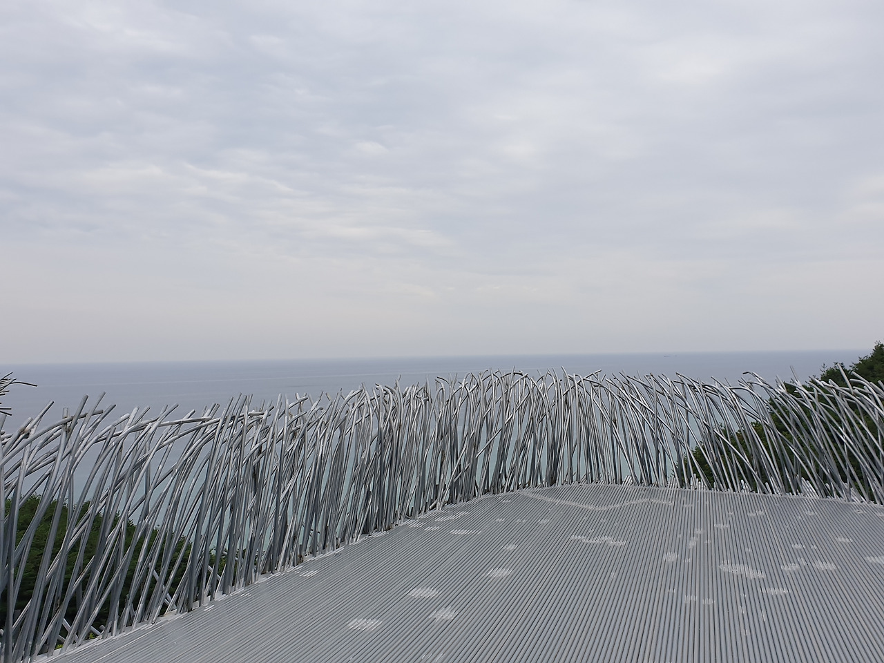 '천국의 계단'으로 들어가기 위해 입구에 들어섰다. 이곳 최대의 장점은 '바다'. 만약, 배경이 바다가 아니고 숲 속이라면 느낌은 분명 다를 것이다. 시작부터 바다를 보니 기분이 좋다. 첫 만남은 철근으로 꾸며진 지금껏 경험하지 못한 새로운 작품이었다. 특히, 유리와 만나니 그 빛은 생동감으로 넘쳤다. 뜨거운 햇볕이 없는 날인데도 자연광으로 인해 아름답게 빛나고 있었다. '철 파이프'가 주는 차가움의 은은함이 마치 구름 위에 떠 있는 착각이 들 정도로 걷는 내내 이 첫 작품이 계속 떠올랐다. 고소공포증이 있는 나로서는 최대한 바닥이 보이지 않는 끝으로 걸어가며 바다와 조금씩 더 가까워졌다.