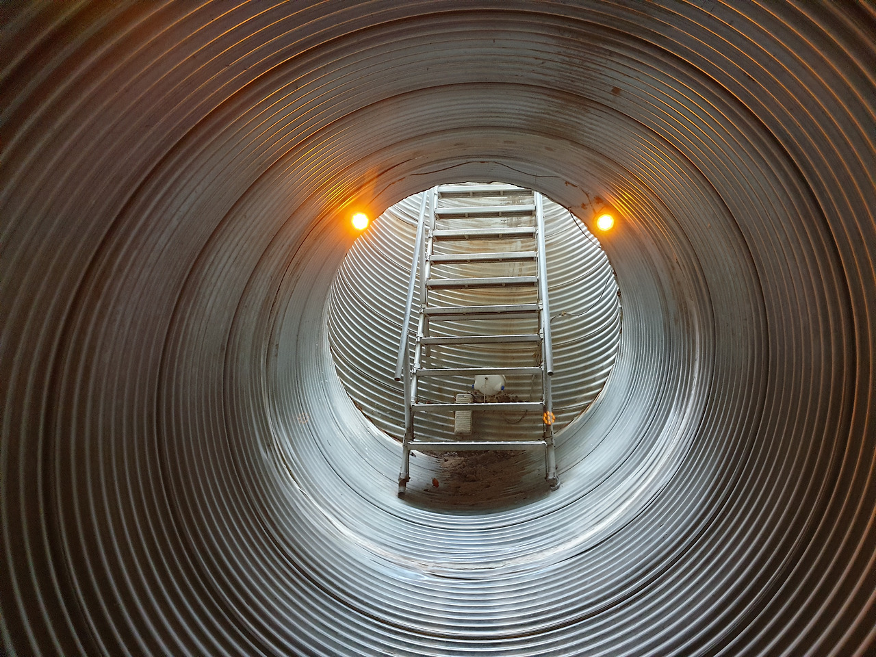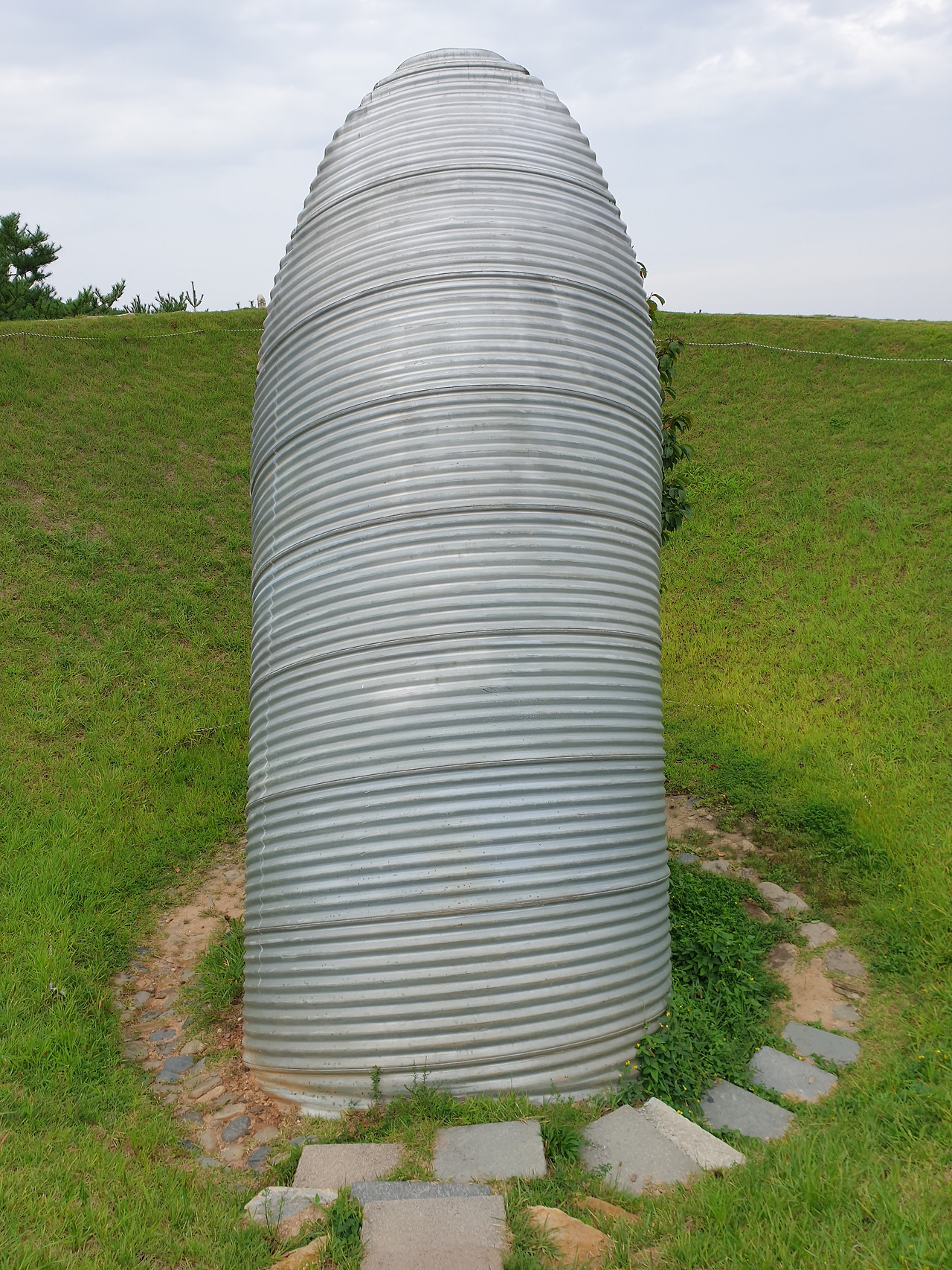 소나무 정원과 여러 작품들을 감상하며 마지막으로 저기 '웅덩이'를 보자며 내려간 곳은 나중에 알고 보니 최영옥 작가의 '해시계'였다. 처음 접하는 '대지미술'도 생소하지만 자연과 조화된 무한한 예술적 추구에 박수를 보내고 싶다. 제주 오름 정상에 서 있는 듯했는데 아래를 보니 큰 파이프가 있어 계단을 내려갔다. 힘들어 안 갈까 했었는데 어떤 부녀가 먼저 내려가서 "와아~!" 하는 소리에 바로 실천했다. 참 재밌는 곳이다. 어떻게 둥근 철 파이프로 이런 다양한 해석을 풀어냈는지 감탄이 마지막엔 나올 수밖에 없다. 빛과 자연, 재료인 철 파이프, 그리고 작가의 상상력으로 완벽한 예술이 탄생했다. 예술을 모르는 나로서도 다른 영감이 떠오를 정도로 꿈틀거리던 에너지가 밖으로 나와 여기저기 춤을 추고 있다.