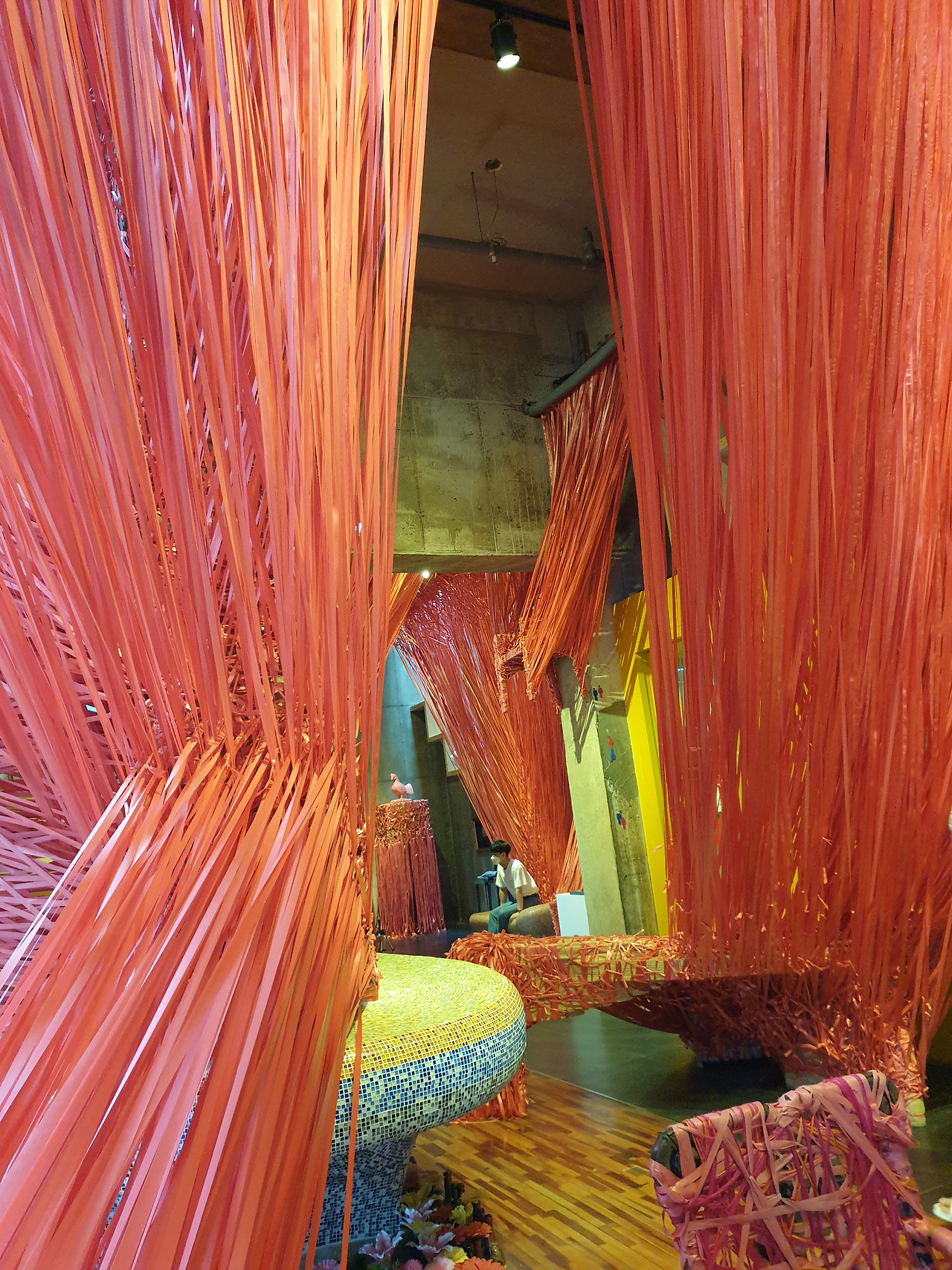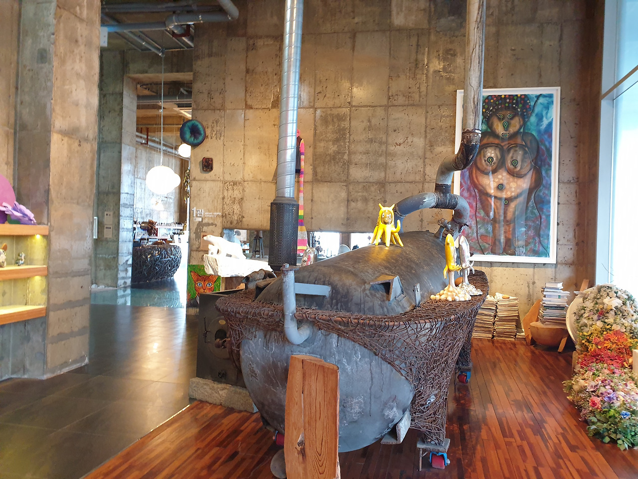 2시가 훌쩍 지난 늦은 점심은, 사치스럽게 바다를 보며 커피 한잔과 피자, 아보카도 샌드위치를 먹었다. 혼자라면 간단히 먹는데 오랜만의 동행이라 가끔씩은 이런 즐거움도 있어야지. 비가 내리는 창문을 보니 여행 온 기분에 흠뻑 더 졌어 들었다. 식사 후, 다음 코스인 내부의 현대미술을 관람했다. 강렬한 색과의 만남이 벌써부터 기대가 된다. 어디든 작품의 무대가 되는 독창적인 시선으로 어떠한 틀에도 구애받지 않는 말 그대로인 현대미술을 만났다. 갑자기 여기 작가의 세계관이 궁금해졌다. 예술은 뼈를 깎는 창작의 고통에서 나온다는 말이 있듯 아마도 평범함보다는 복잡한 사고로 이 시간들도 지나고 있겠지.