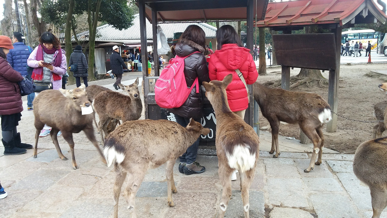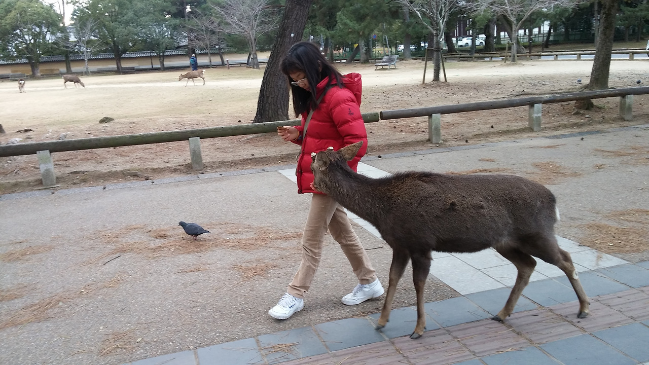 다음날은 일본의 옛 수도인 나라를 방문했다. 나라는 사슴이 정말 많다. 도착하자마자 사슴들이 곳곳에 있어 깜짝깜짝 놀라기도 하지만 그 재미도 쏠쏠하다. 동물원도 아니고 어디서 이 많은 사슴을 볼 수 있겠는가. 중1을 앞둔 조카는 워낙 동물을 좋아해 여기저기서 사슴이 보이자 뛰어다니며 즐기는 모습을 보니 뿌듯했다. 옆으로 가서 만지기도 하고 큰 이모 옆으로 오면 사슴한테 호통도 치며 저리 가라고 밀기도 했다. 나와 언니는 공원 도착 후 계속 소리를 지르며 사슴을 피하기 바빴다. 점심때가 한참 지나 시장에서 인생 카레를 먹고 다 같이 즐겁게 기차를 타고 다시 시내로 들어왔다.