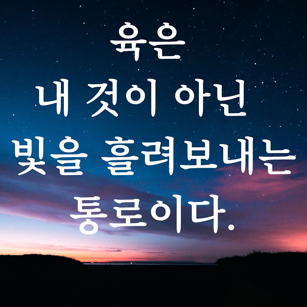 몸을 통해 사랑하고, 인내하고, 순종하며 그 사랑을 이웃에게 흘려보내는 빛의 통로로 살아가야 한다. 그리하여 우리는 우리 몸으로 하나님께 영광 돌리는 삶을 살아야 한다.