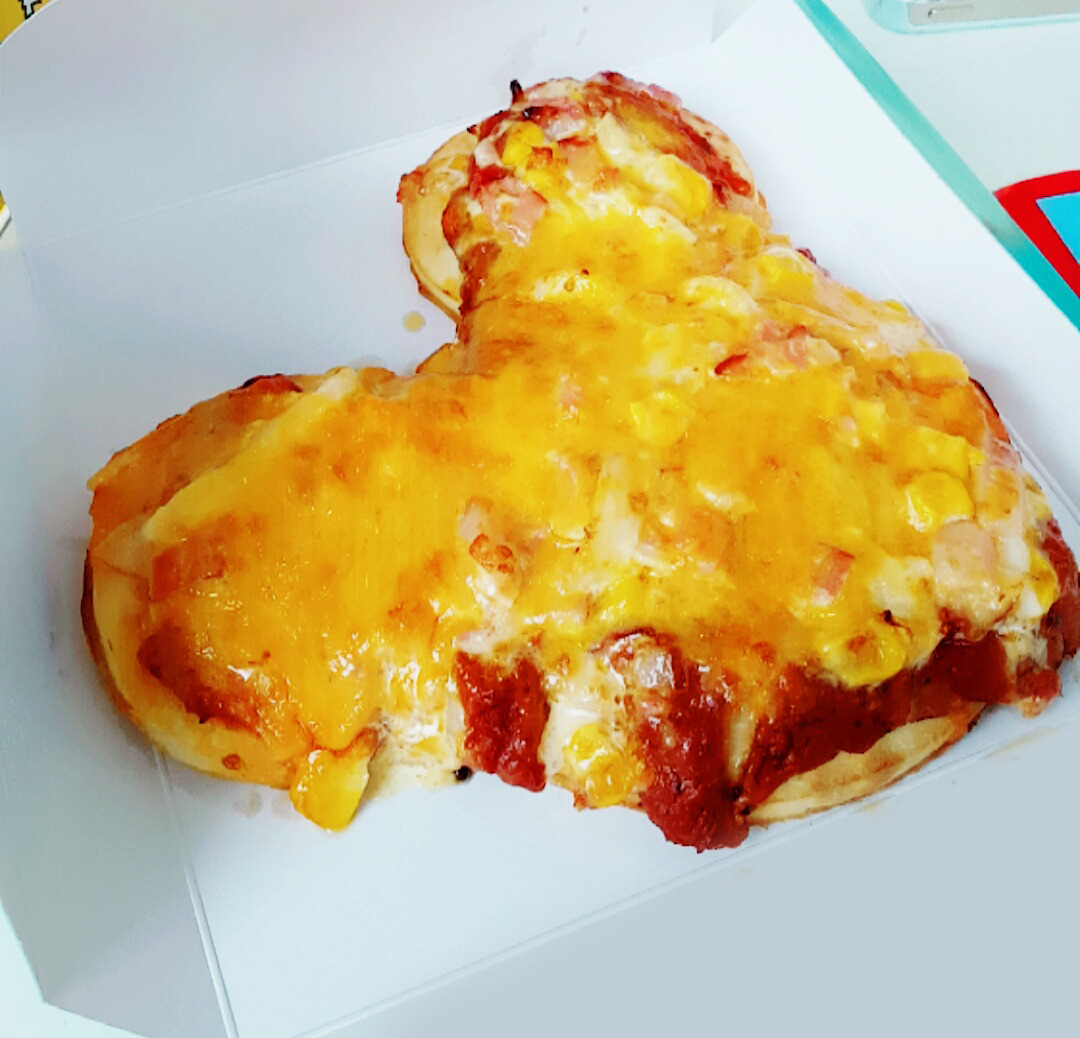미키마우스 손 모양의 햄버거랑 미키마우스 모양의 피자를 팔고 있었다.