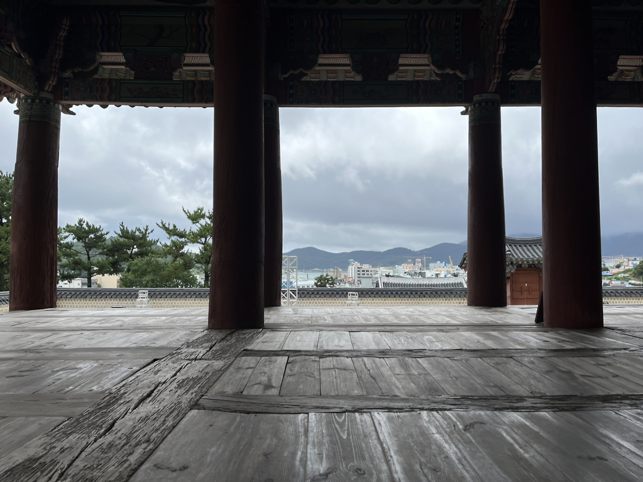 충렬사에서 나와 다시 골목길을 둘러 다니며, 수군 통제영으로 간다. 세병관 거대 현판이 보인다. 마루에 앉아 바람을 맞으며 바다에 면한 조선소, 동네들을 내다보고 거대한 기둥, 보를 구경한다. 어디서 이 큰 나무들을 구해 어떻게 옮기고 다듬고 세웠을까, 대단하다. 바다에서 배를 만드는 기술과 갖추어진 기반이 영향을 주었을 것이다. 지금의 우리는 기계와 컴퓨터의 도움을 받아 구조용 집성목을 구조 계산하고 이동까지 고려한 최대 가능 부재 사이즈를 고려해서 부재 단위를 나눈 후, CNC 머신으로 다듬은 후 이음 부분을 철로 구조보강을 하고.. 거대 공간을 만들 것이다, 여수 진남관은 해체 복원 작업 중이라고 한다.