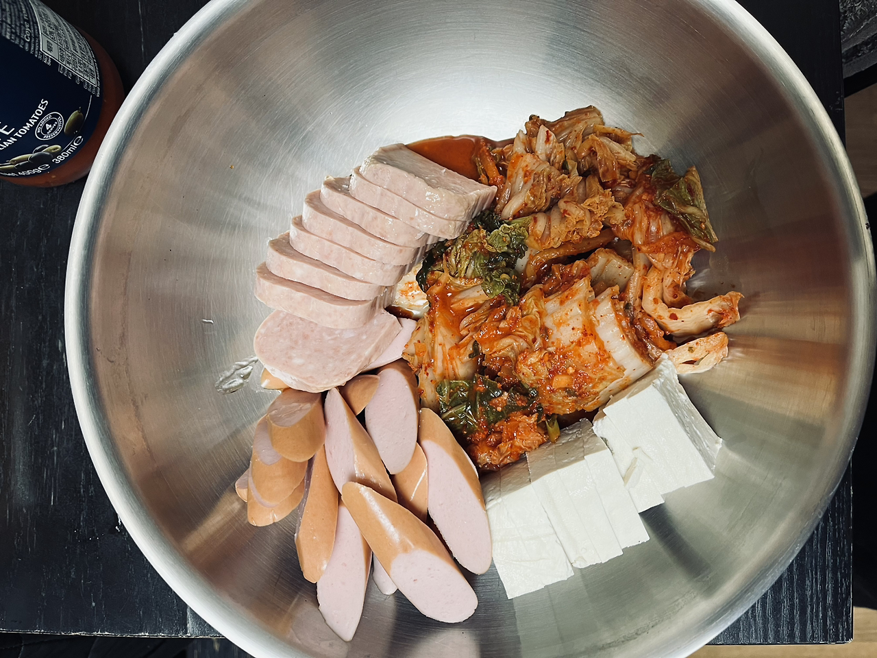 시장에서 잡아온 서울맛의 깔끔하게 칼칼하고 시원한 익힌 김치를 썰어 담고, 강릉에서 온 바닷물에 단단해진 두부, 외쿡에서 온 스팸과 소시지를 잘 정렬해 넣는다. 나의 레시피, 바질 등 향신료와 토마토가 어우러진 ‘파스타 소스’를 두 큰 술 넣고, 특별히 생수를 붓고 보글보글 끓인다. 모두가 흐물흐물 어우러지면 떡국떡 약간과 라면사리를 넣고 충분히 익힌 후불을 끈다.