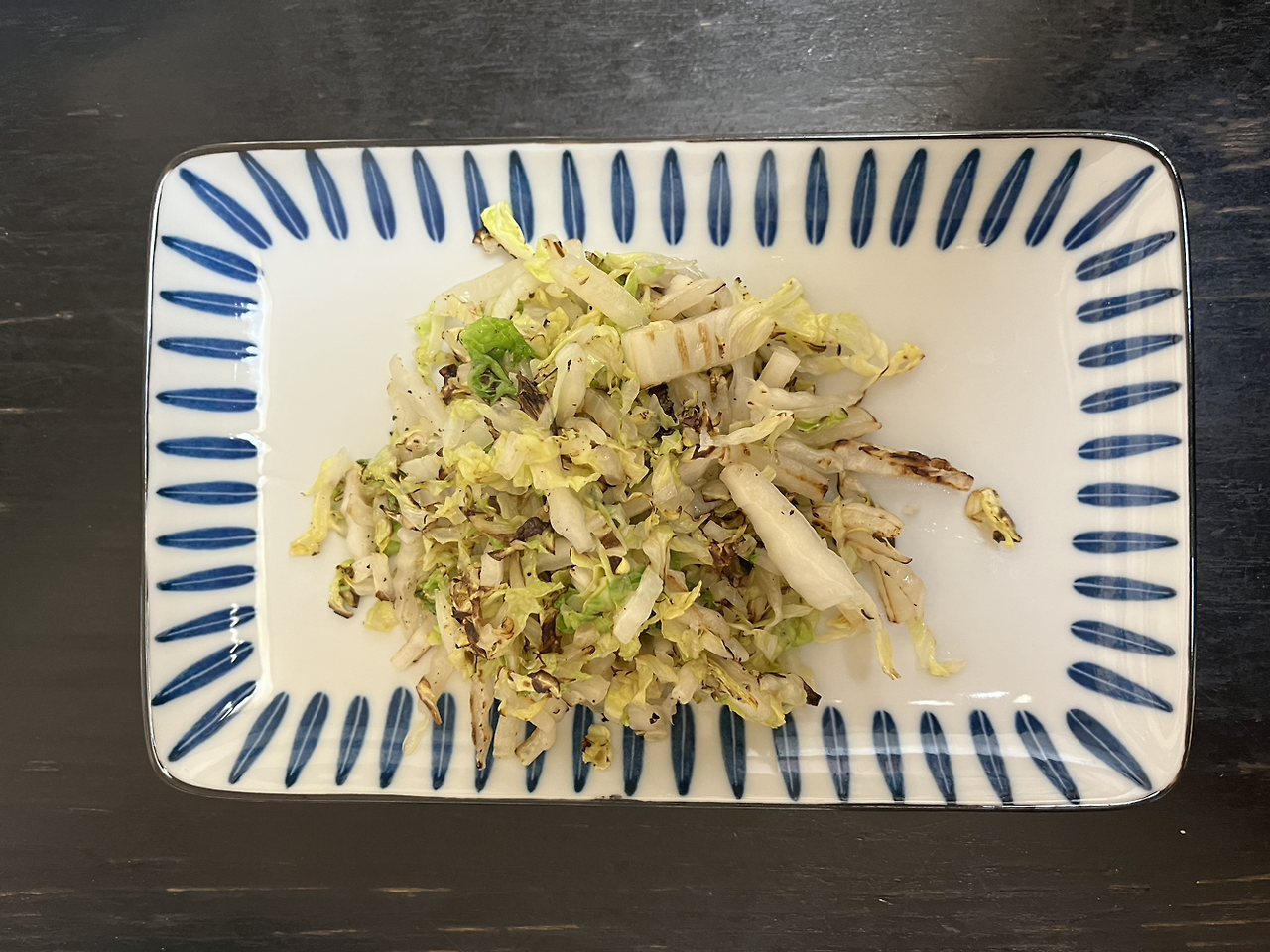 배춧잎을 씻어 물기를 탈탈 턴다. 잎을 길게 자르거나 돌돌 말아 썰기 좋게 한 후 얇게 채친다. 마른 팬을 강불로 달구다가 배추를 넣고 볶아준다, 불의 맛이 나는 맛있는 갈색반응이 일어날 때까지. 그때 오일을 적당히(약간) 두르고 더 볶다가 굵은 후추, 굵은 소금을 툭툭 뿌리고 잘 섞는다.