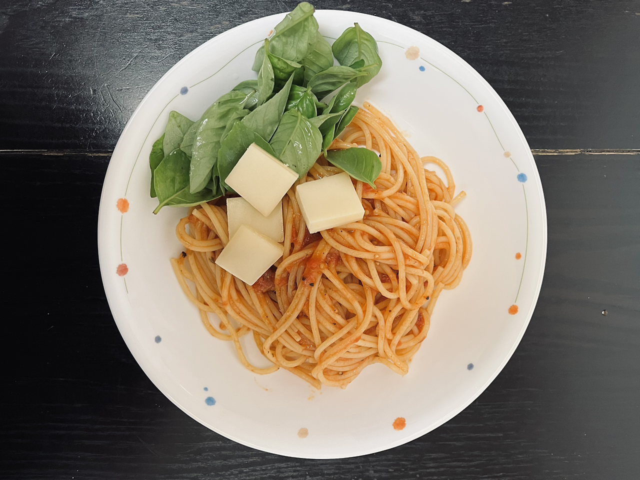 토마토소스 세 큰 술과 푹익은, 작은 크기의 토마토 5개를 넣고 약한 불에 끓이다가, 토마토 껍질은 건져내었다. 익은 면의 물기를 털어내고 소스팬에 담고 잘 섞는다. 단맛이 강한 토마토여서 후추를 평소보다 팍팍 넣었다. 올리브오일을 듬뿍 둘러주고 먹음직스럽게 담는다. 바로 딴 바질을 한주먹을 올리고, 조금 오래된 자투리 치즈를 찾아서 같이 먹었다.
