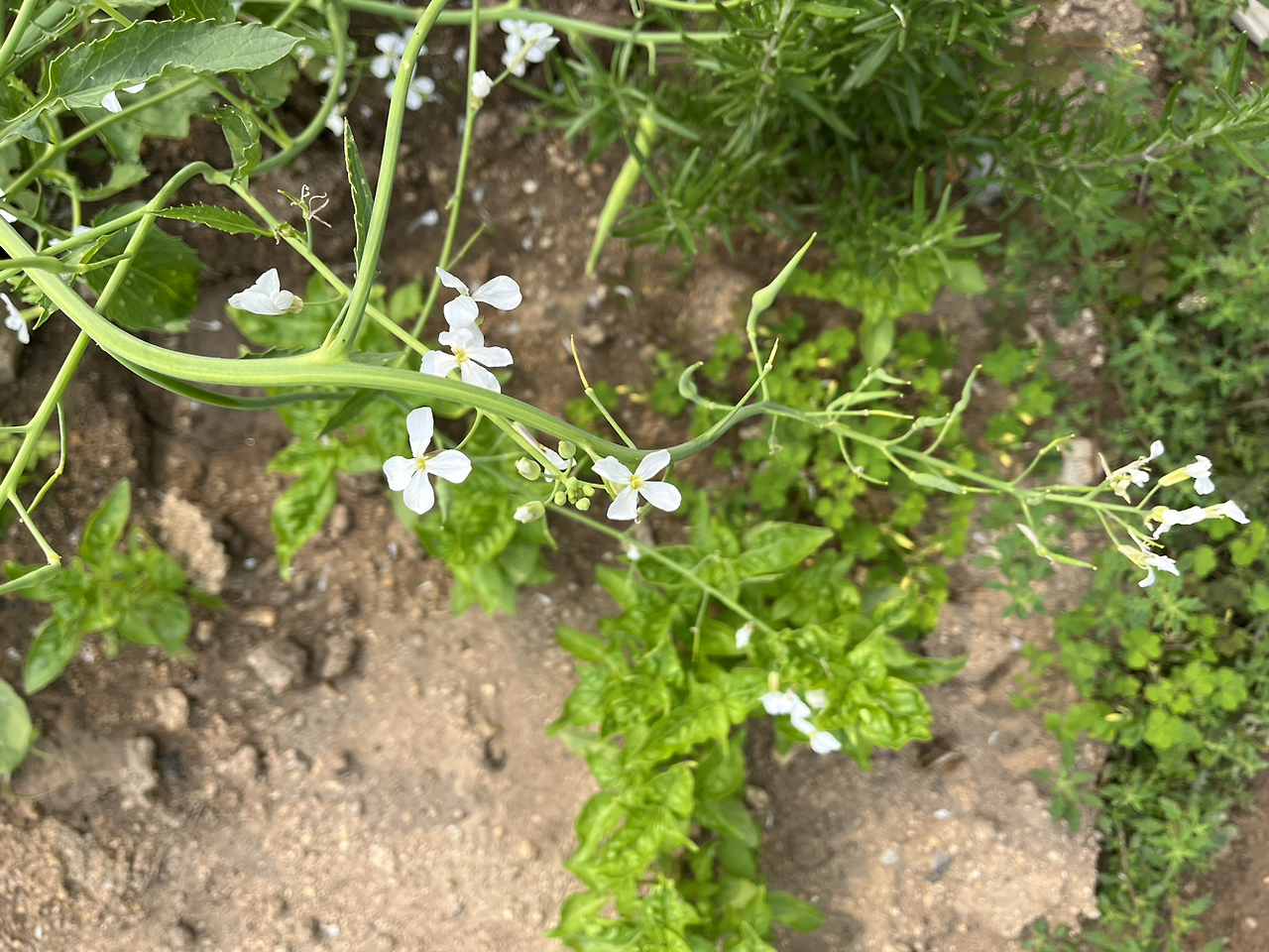 열무를 두 번 수확했는데, 꽃을 피운 하나는 잘 키우고 있다. 줄기가 튼튼하게 뻗었고 노란 꽃술과 가운데 잎맥이 도드라저보이는 작은 흰 잎 네 장을 가진 꽃이 피었다. 열매는 길쭉한 자루모양으로 영리한 씨앗이 그 안에서, 시기를 가다듬고 있다는 것을 짐작하게 한다. 씨앗이 펑 터져 땅으로 땅으로 자라서 다시 싹이 나고 잎이 올라올 것 같다. 열무는 여리지 않다.