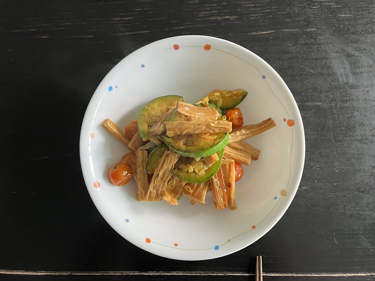 다른 양념을 하지 않아도 짭자름한 콩두부 푸주의 맛과 새콤한 토마토와 달작한 호박, 이 세 가지의 맛이 잘 엉겨 어우러진 한 접시의 맛이다. 사진은 방울토마토를 넣은 것인데, 큰 토마토를 잘라 사용하면 더 좋다.
