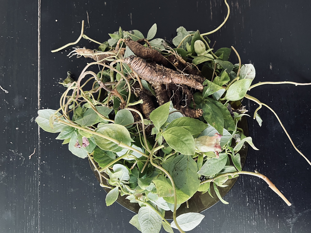 텃밭에 심어두었던 더덕이 상한 줄기도 있어서 캐보려고 생각하고 있었는데, 더덕을 넣고 백숙을 하면 된다는 ‘마미 레시피’를 듣고는 더위가 가시기 전에 잡아먹기로 했다. 더덕들이 뿌리를 잘 내려서 처음보다 (심었을 때) 많은 양의 더덕 뿌리를 캤고, j가 잎과 꽃, 열매 부분까지 깨끗하게 고르고, 다듬었다. 뿌리를 손질하자 신선한 더덕향이 건강하고 기분 좋게 나기 시작한다. 하얀 배 속살이 부드럽게 압축되고 결이 생긴 것 마냥 진액이 스며있다.