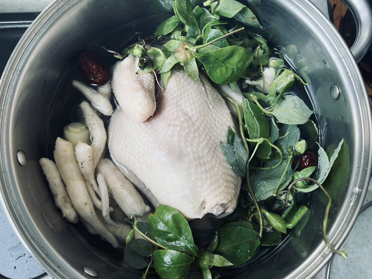 닭을 다듬고 끓는 물에 데쳐 준비하고, 대추, 마늘, 파 그리고 더덕을 채우고 물을 부었다. 집에 더덕의 향이 퍼진다. 인삼과는 다르게, 약재보다는 푸릇푸릇하게 진귀한 야채를 듬뿍 넣은 어린 마녀의 초록 수프 같다. 한 시간 반 동안 끓였고, 초벌까지 더하면 두 시간 정도 걸렸다. 닭은 후드득 분해될 정도로 삶아졌고, 더덕이 부드럽게 익었다. 녹회색의 걸쭉한 국물과 열매 봉우리들을 떠서 국그릇에 담는다.