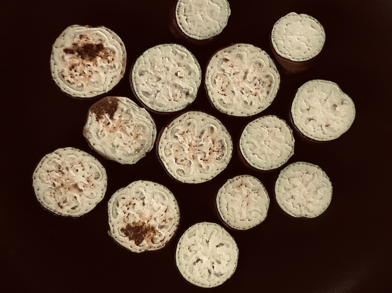 텃밭에서 수확한 가지를 어떻게 맛있게 먹을까 생각하다 만든 나대로의 방법이다. 가지나물은 어려웠고, 물컹한 식감보다는 단단하게 먹고 싶었으며, 간단한 조리법으로 가지의 맛을 잘 살리길 바랬다. 가지만으로 구운 것은 약간 밋밋함이 느껴졌고, 올리브 오일이 더해져서 풍성해졌다. 올리브 오일을 신선하게 먹기 위해서 불을 끄고 팬의 온도를 낮춘 상태에서 가지에 흡수되도록 하는 것이 필요하다. 접시에 담을 때 오일 머금은 쪽을 위로하여 보기에도 좋고, 접시에 오일이 묻지 않게 해서 정리할 때도 편하다. 먹을 때에 가지 전체에 오일이 흡수되어 있는 상태보다는 한쪽 면에 있다가 씹으면서 가지 즙과 섞이는 것이 좋다. 가지 껍질의 단단함이 살아있어서 씹는 맛이 있고 즙이 가득하고, 올리브 오일의 톡 쏘는 윤기가 잘 어우러져서 맛있다. 가끔은 후추를 살짝 뿌려 먹는다.