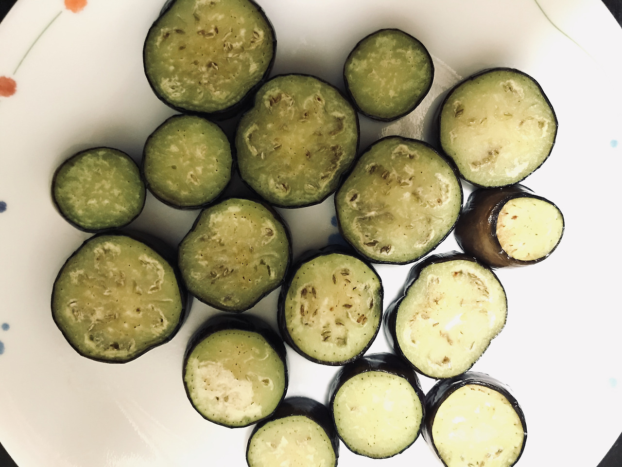 가지 겉 면이 수직이 되도록 자르고, 1.8cm이상 되어야 씹는 맛이 좋은 것 같다.
