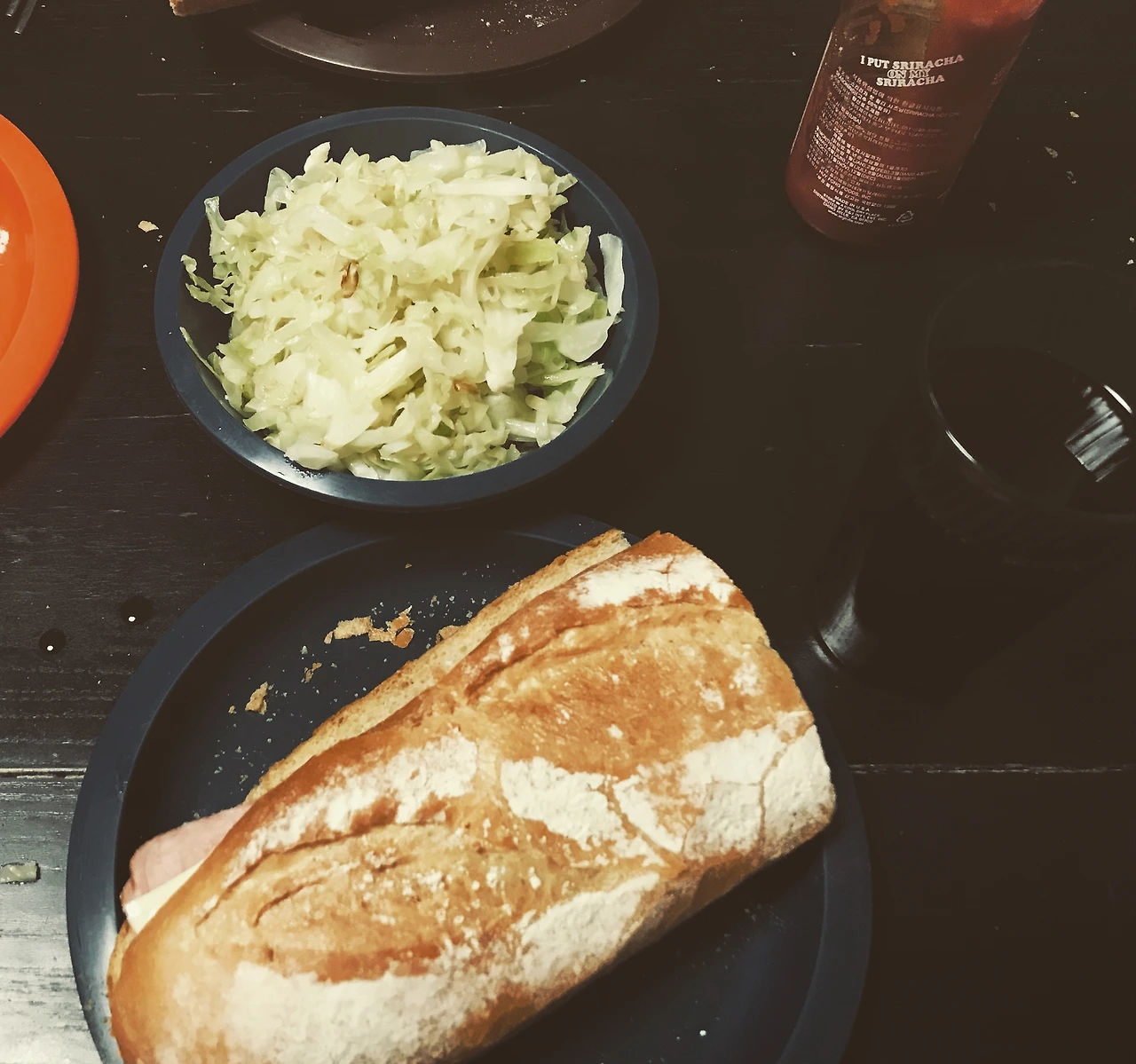 바게트 샌드위치와 양배추 볶음 + 스리라차 소스