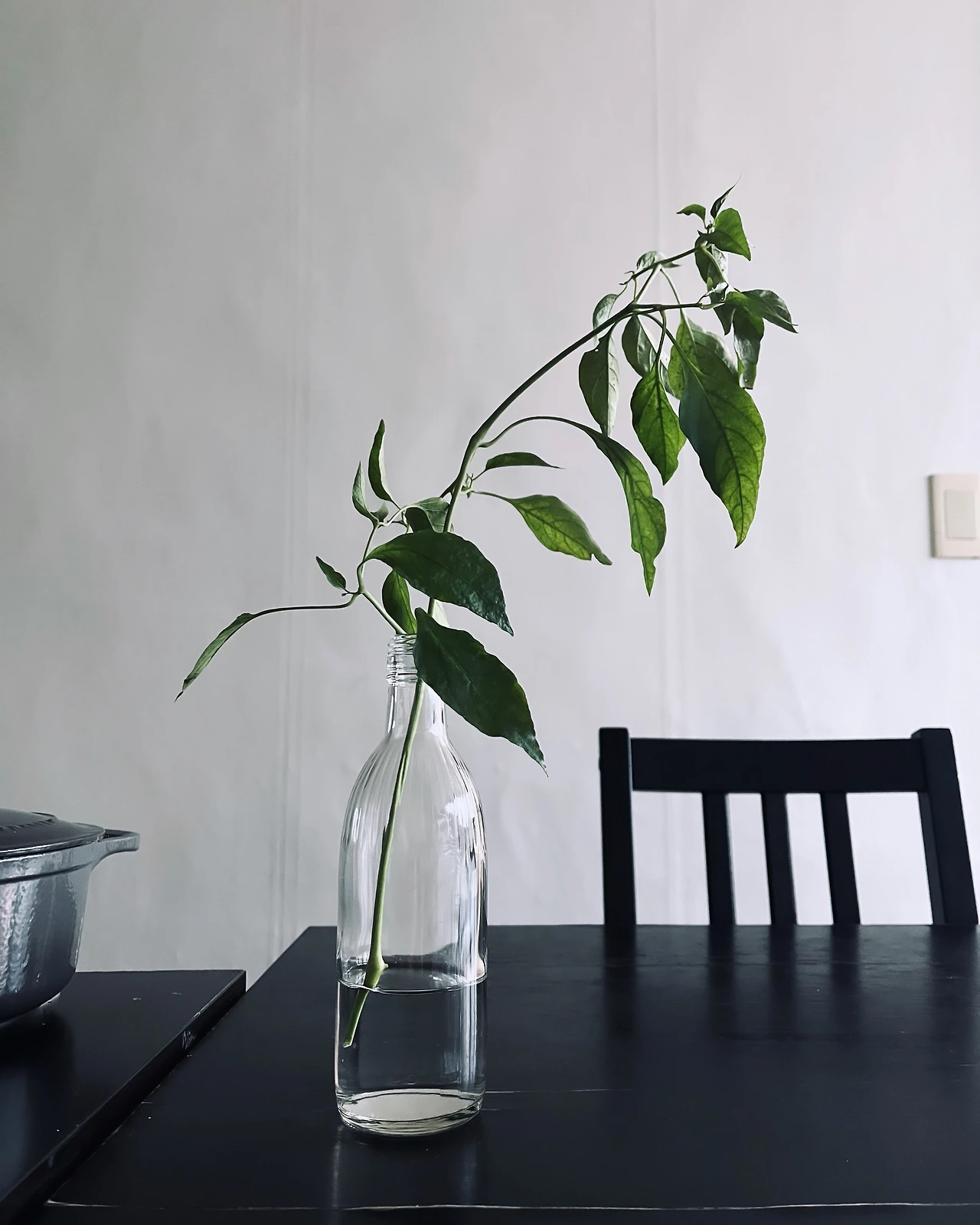 꽃대 튀김을 해보고 싶어서 바질 꽃대를 채집하러 밭에 갔었는데 아직은 영하의 날씨가 아니었지만 전날 온 비바람과 떨어진 기온에 냉해를 입은 것들이 보였다. 역시나 이웃 밭 작물들에는 도톰한 비닐이 덮여 있었다, 텃밭에서 사람들이 때를 맞추는 것은 다 이유가 있는 법이다. 거둘 것은 챙겨서 집으로 가져왔는데, 고춧대도 잘라왔다. 이렇게 집에 가져온 것은 잎을 따서 삶아 나물로 무쳐먹을 요량이었지만, 가만히 살펴보니 탁 꺾인 마디와 끝이 붓자락처럼 툭 떨어지는 길쭉한 잎새가 '알랙산더 칼더'의 모빌을 연상시키는 것이 마음에 들어서 병에 꽂아두었다. 새벽 두 시가 되면 영하로 떨어진다는 일기예보를 믿고 따뜻한 나의 책상 앞에서 기다리고 있다, 차가운 세계를. "오, 인간들이여. 고래를 칭송하며 본받을 지니! 그대들도 얼음물에서 온기를 유지하라. 그대들도 세상에 살되 그곳의 일부가 되지 마라. 적도에서는 서늘하게 지내고 극지에서는 피를 돌게 하라. 성베드로 성당의 커다란 돔 지붕처럼, 그리고 커다란 돌고래처럼. 오 인간들이여, 사계절 어느 때건 그대만의 체온을 유지하라. 하지만 이런 미덕을 가르치는 것은 얼마나 쉽고 또 부질없는가! 세상에 성베드로 성당처럼 돔을 얹은 건축물이 얼마나 되며, 고래만큼 큰 생물은 또 몇이나 되겠는가!" - 허먼 멜빌 "모비딕" 열린 책들