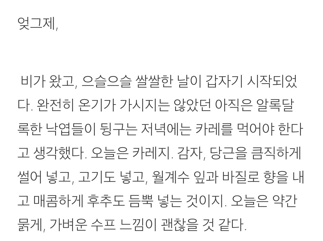 오늘도 이런 날이다. 생각한 재료와 형태도 같다. 사람이 이렇게 크게 벗어나질 않는다. 언덕으로 이사 왔기 때문에 보름정도 시기가 당겨진 것일까, 비가 온 다음인 것일까. 아침에 산길로 산책을 다녀오는데 싸릿눈이 흩날렸다. 그래도, 같은 재료이지만 이- 요리하는 사람인 나의 기술이, 구체적인 개인의 요구를 해결하는 능력이 1년 동안 조금 늘었기 때문에 어제보다 마음에 드는 카레를 만들었다.