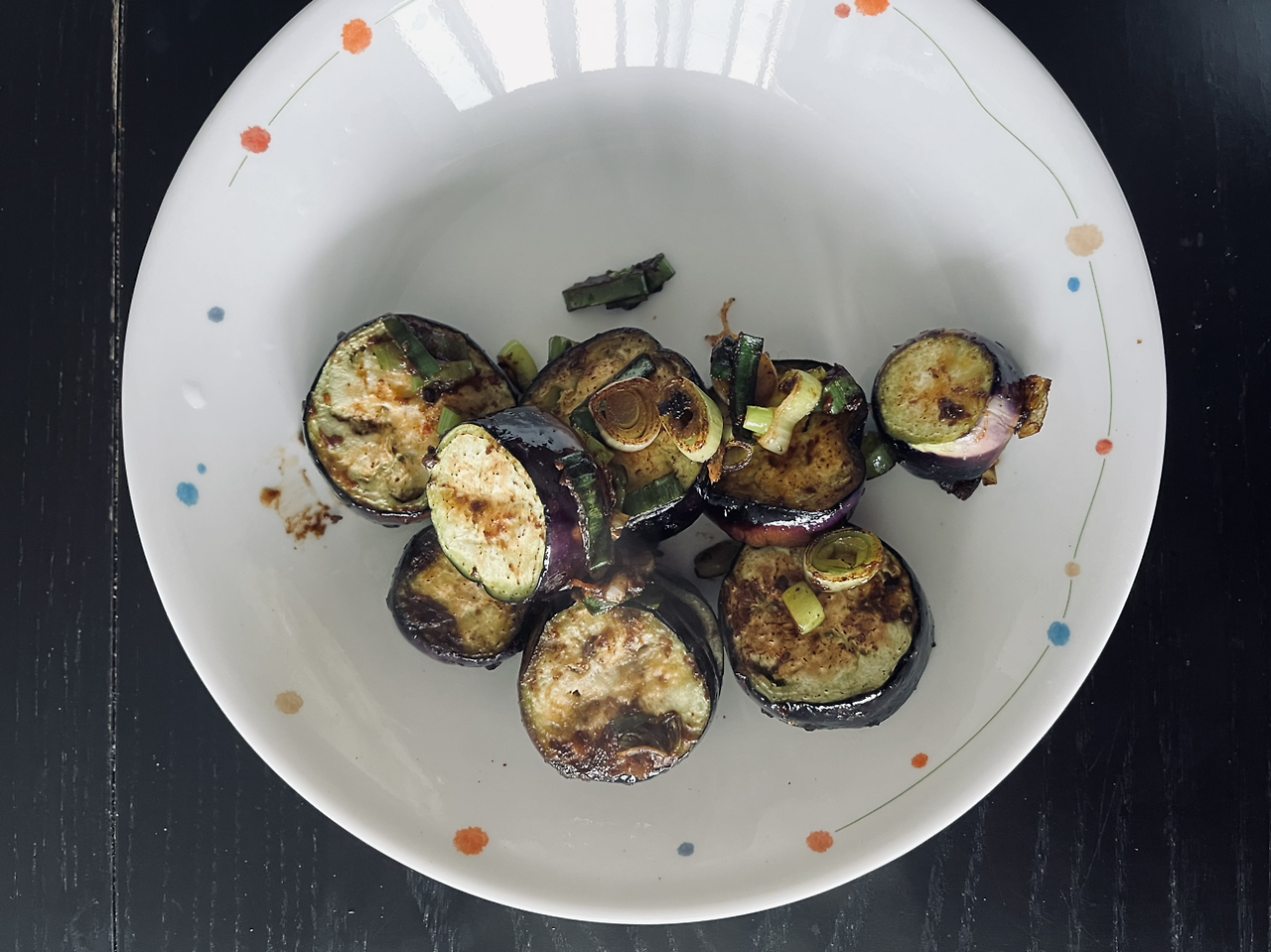 가지를 2cm 두께로 통썰기 하고 팬에 펼쳐서 한 면을 굽고 (보라색 표면의 반이 갈색이 될 때까지) 한번 뒤집어서 마저 굽다가 한켠으로 모아둡니다. 이렇게 구우면 겉이 구워지면서 씹는 맛이 살아있는 상태가 됩니다. (이대로도 아주 맛있음) 한쪽에 올리브오일을 약간 붓고 파를 볶다가 된장을 넣어서 (반 티스푼 정도) 같이 볶고 마라소스도 소량, 손톱만큼? (티스푼 끝으로 약간 떠서) 넣고 구운 가지와 섞어줍니다. 파 기름에 볶은 된장에 알싸한 마라맛을 더한 기름진 소스와 가지가 어우러져서 맛있습니다. 마라소스가 없다면 된장만으로 소스를 만들거나 고춧가루나 페퍼론치노를 약간 넣어도 좋을 것 같습니다. 올리브오일에 볶으면 더 신선한 맛을 주고 소스는 기호에 따라 굴소스 등 좋아하는 것을 만들면 됩니다. 가지를 구워서 볶으면 가지를 맛있게 살려줍니다.