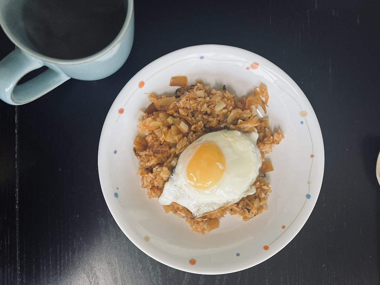 바질향이 살짝 감도는 꼬슬꼬슬한 밥 맛이 살아있고 짭짤한 볶은 김치 사이에 아삭하면서 상큼한 양파가 함께 씹히는 김치볶음밥