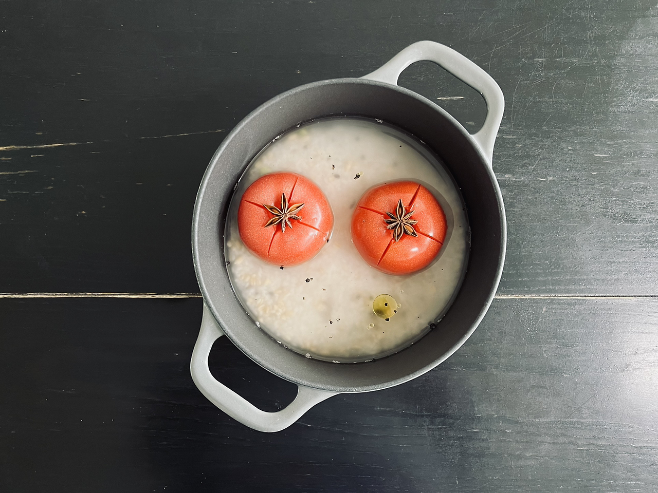 토마토 위에 얹어진 팔각(스타 아니스, star anise)은 뚜껑 닫기 전에 밥물 위로 내려놓았습니다.