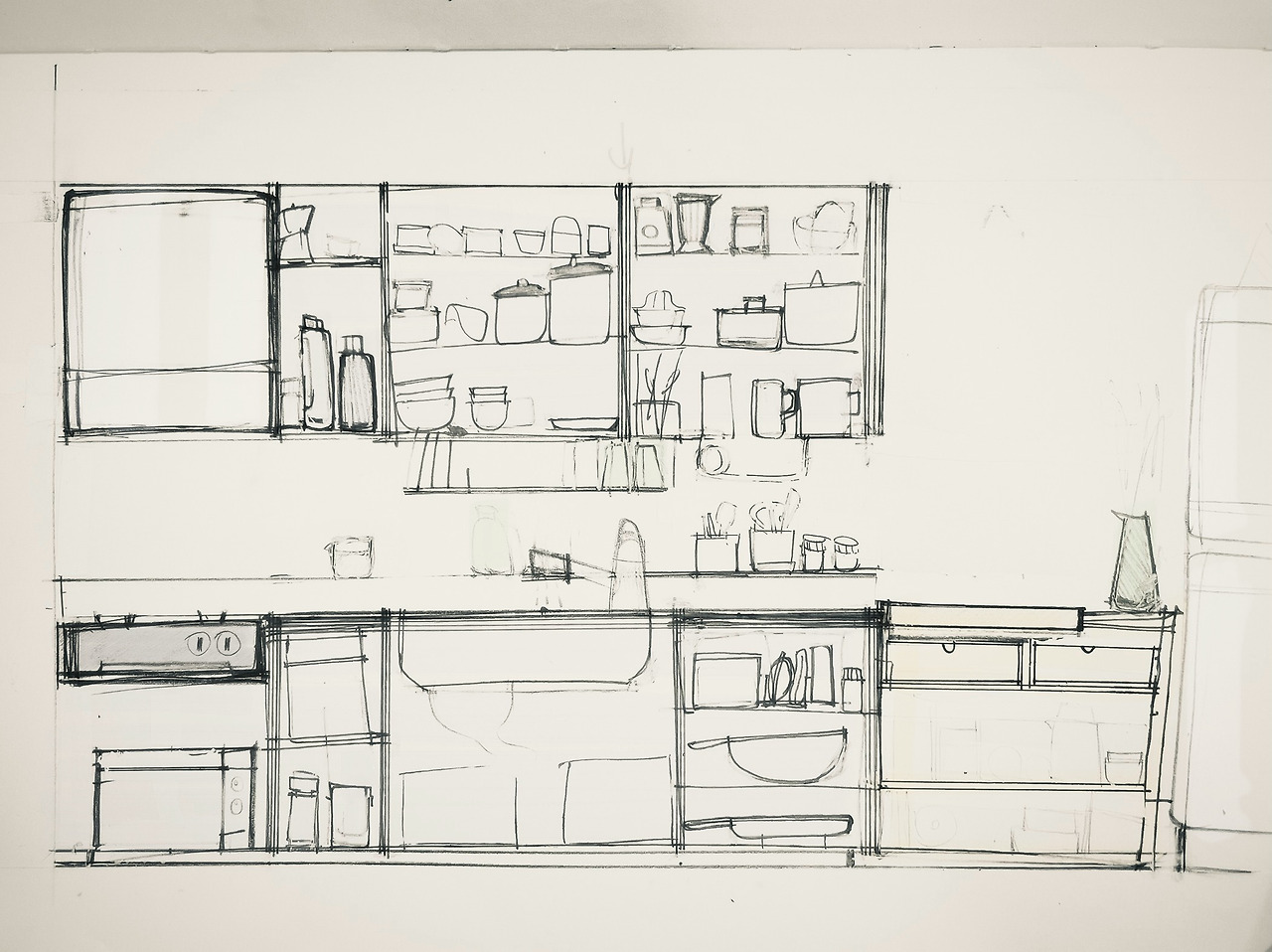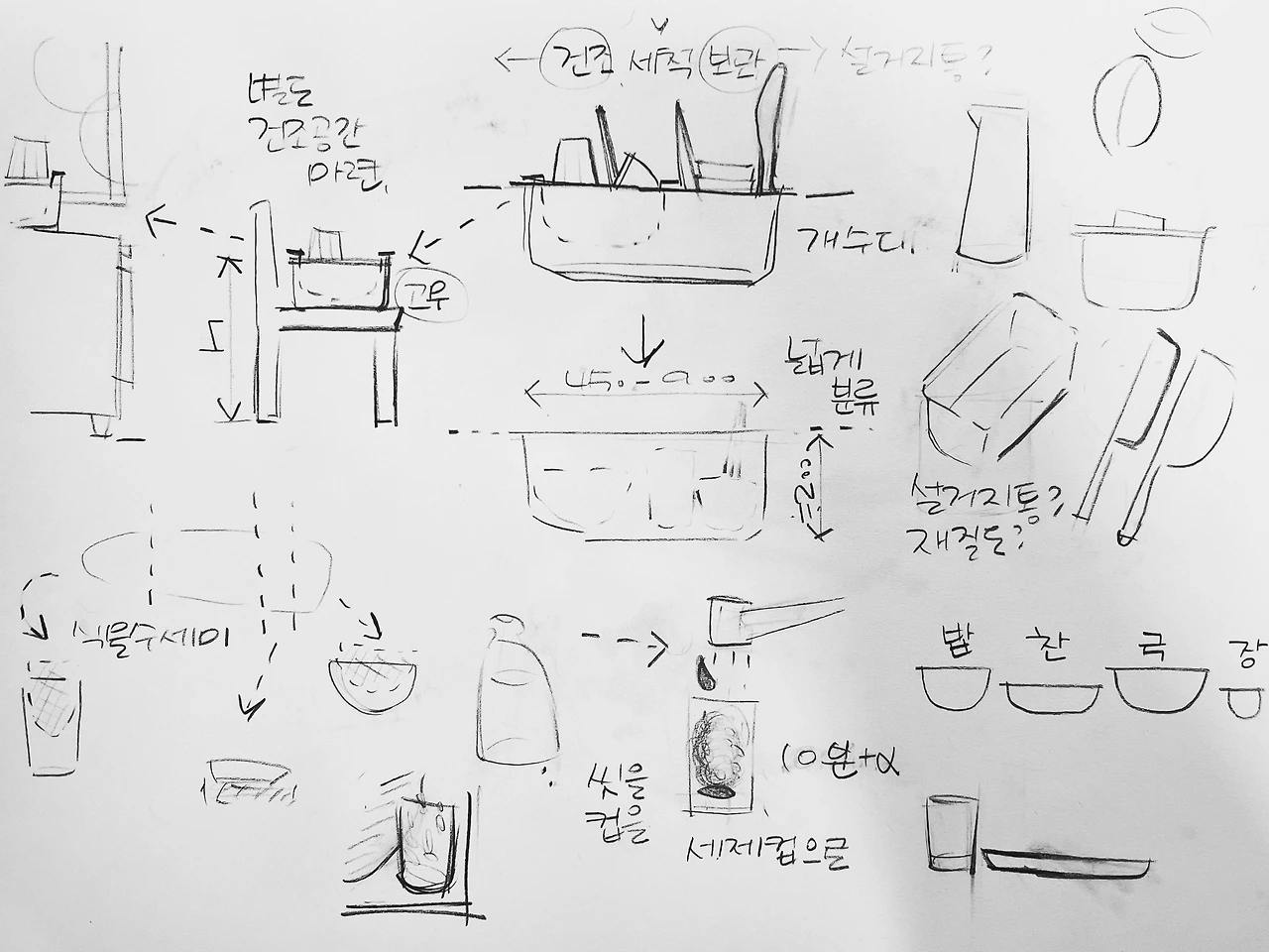 그리고 요리를 하기 위해 물을 쓰는 곳과 요리 후의 처리를 하기 위한 곳이 한 군데서 이루어진다는 점도 우리가 그 둘을 분리하는 방법을 찾는 것으로 운영된다. 더 깔끔함의 우선순위에 있는 요리를 깨끗한 상태를 유지하며 세척볼을 따로 놓고 작업하고 하위에 있는 설거지는 싱크대를 그대로 이용하는 것으로 구분. 혹은 싱크대를 그대로 재료 처리에 쓰기 위해서는 항상 세척된 상태를 유지하는 것. 그러면 역으로 설거지통이 필수로 들어올지도 모르겠다.