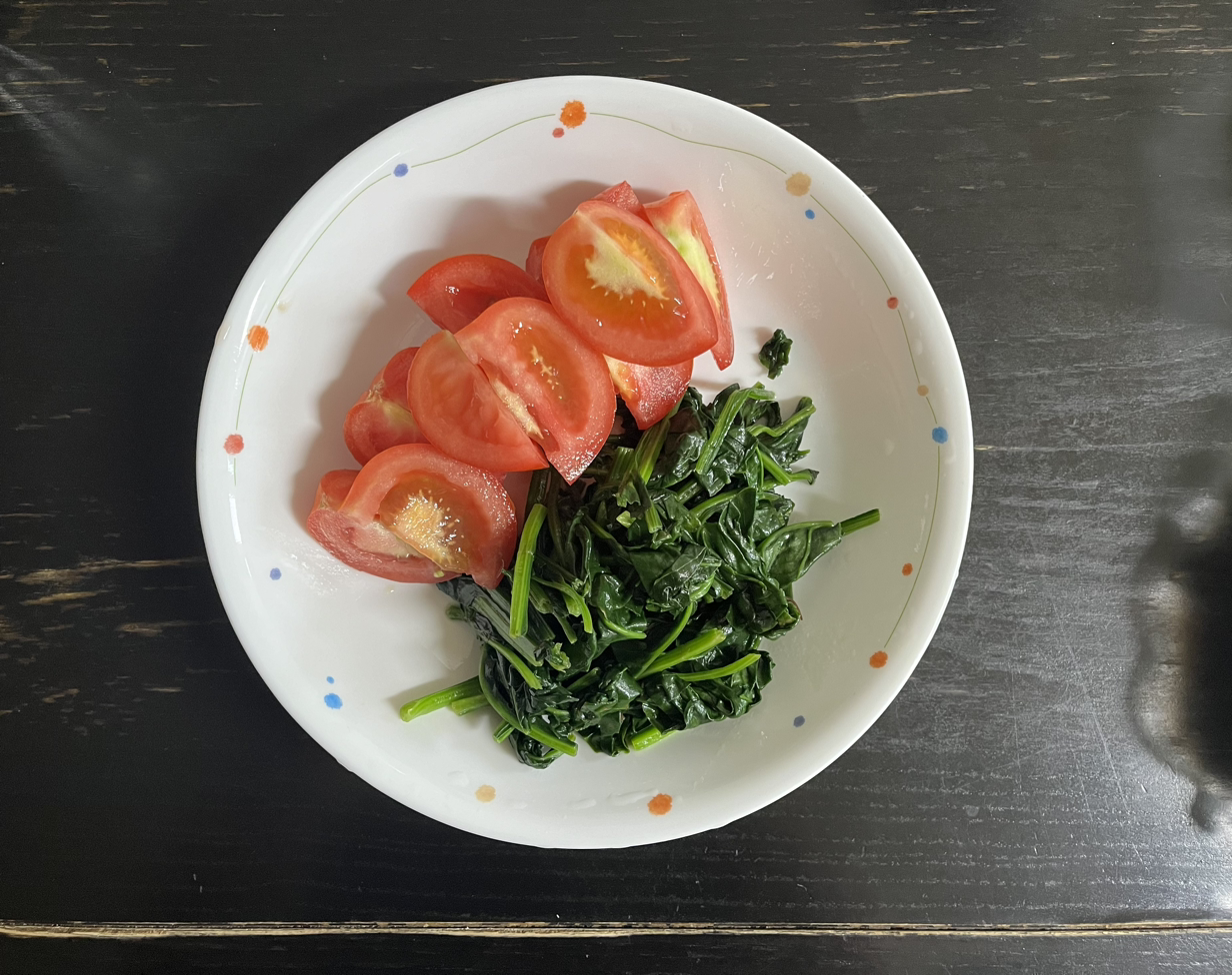 시금치는 기본적으로 짠맛이 있어서 소스는 약간만 맛을 주도록 조금 뿌리고 신선한 올리브오일에 무치듯이 섞는 것이 내가 생각한 맛의 포인트. 마른 팬에 볶기 시작하면 수분이 나오면서 맛과 색이 진해졌다. 바다의 맛을 한 방울 더하고, 붉은 생 토마토를 곁들여서 한 접시를 완성!
