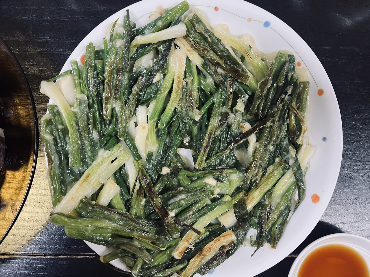 쪽파뿌리를 잘라내고 흙을 털며 찬 물에 하나씩 하나씩 뿌리부터 줄기의 끝까지 훑으면서 맑은 물줄기에 붉게 된 손과 바짝 긴장해서 또렷해진 정신이 깨끗하게 쪽파 다듬기에 집중하며 차곡차곡 다듬어진 더미를 한켠에 쌓아두고 이걸 다루는 손길은 사뭇 진지해진다 손은 여전히 찹다 밀가루에 소금 한 꼬집 물 적당히 묽게 반죽을 만들어두고 뿌리부터 간격을 두고 자르다가 끝에 가면 남은, 시든 것들은 과감하게 잘라내어 가지런하게 놓아본다 줄지어 부칠 수도 있지만 프라이팬에 동그랗게 가득 채워서 만들다가 반동을 이용한 뒤집기 양면 굽기 기술을 더하는 것이 파전 완성의 즐거움, 알맞게 잘린 파를 젓가락으로 찢어서 간장에 찍어 바삭함 보다는 부드럽고 달콤한 파를 잔뜩 맛보는 것이 우리 집의 겨울 쪽파전.