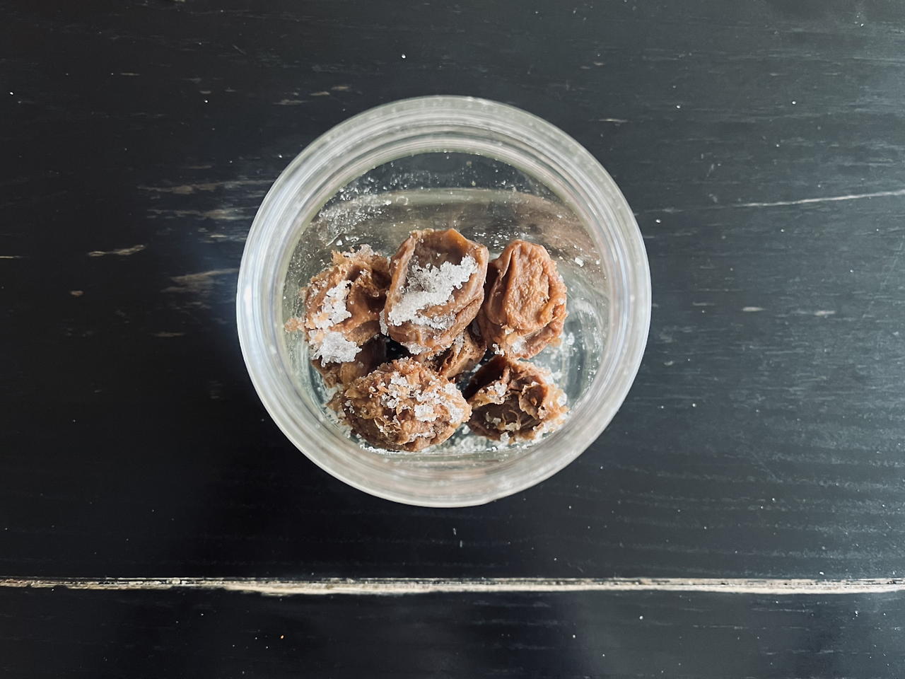 이게 어떻게 만들어졌는지 말하려면 얼마 전 소금이 떨어진 날부터 시작해야 합니다. 굵은 바다 소금 한 포대 살 준비를 하고 있었는데 소금통이 비었습니다. 소금이 꼭 필요한 순간은 피하고 있었는데 임시방편으로 매실소금절임의 소금을 떼어다 쓰기로 마음을 먹은 때이죠. 소금알갱이들이 잔뜩 묻은 10년 묵은 매실입니다. 이게 뭔고 하니, 삼거리 살 적에 만든 첫 매실소금절임입니다. 과감한 j답게 소금 양을 조절하지 않고 거의 소금 더미에 묻어두었던 매실이죠. 매실 향이 좋으니까 맛있게 먹었지만 확실히 짰고 먹는 요령이 없어서 남은 양이 많았기 때문에 그 해에 다 먹을 수가 없었습니다, 다음 해가 돌아오고 새 매실을 절였기 때문에, 새 절임이 맛있었고 먹기 편해서 이 첫 매실들은 용기에 담겨, 비닐에 담겨 부엌 장의 구석구석으로 보내졌었습니다. 그것들은 10년 동안 말라갔고 표면에는 소금알갱이들이 맺혔습니다, 먹다 보면 안에 소금결정이 씹히기도 했습니다. 저는 바로 그 소금을 모아서 요리에 쓰려던 것이었습니다. 일종의 매실소금이죠.