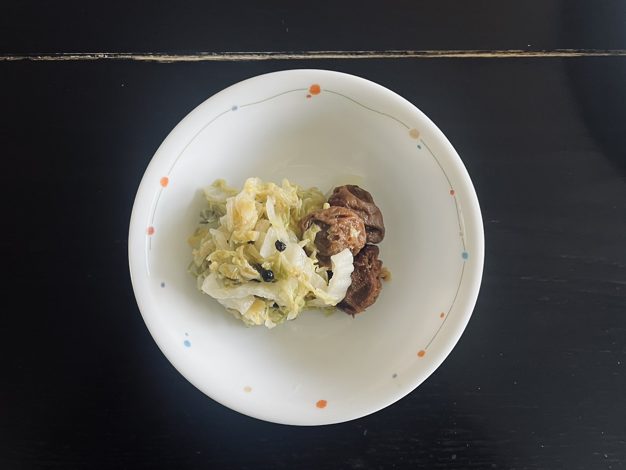 채친 배추에 소금, 후추, 매실절임을 넣고 올리브오일을 약간씩 넣으면서 볶습니다. 따뜻할 때 한 접시 담아서 먹고 나머지는 냉장고에 2-3일 넣어두었다가 꺼내 먹었습니다. 볶은 배추를 보관한 것이어서 분명 절임인데 흘러나온 수분이 없습니다. 오래 말려져서 건조한 소금매실이 수분을 뺏어가면서 맛을 더하고 빠르게 배추 숙성을 도운 것 같습니다. 보기에도 그렇고 볶음의 흔적보다는 이건 완전히 절여진 배추인데 생배추는 아니면서도 매실의 새콤함과 향신료 후추까지 더해져서 본의 아니게 배추 슈크르트가 되었습니다. 고기와 곁들이면 아주 좋을 맛입니다. 그러니까 이건 슈크르트를 양배추 대신에 배추로 해도 좋다는 얘기입니다! 우리가 이걸 김치라고 부르기로 했다는 사실은 접어두고 이건 사실 헹궈서 꼭 짠 묵은 김치 같다고 할까요. 매실이 독특한 역할을 했습니다.