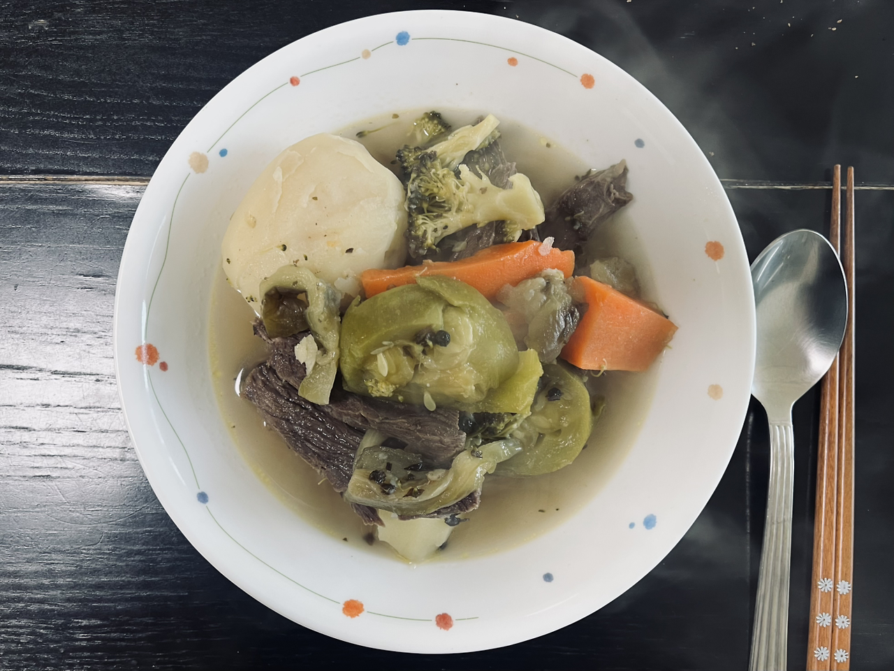 영하 십 도까지 내려가던 긴 추위가 잠시 물러가고 봄날같이 따뜻하게 햇빛이 내리는, 설을 앞둔 1월의 어느 날, 마미가 시골에서 사 오신 양지 한 근을 어떻게 요리할까 생각하다가 오랜만에 포토푸를 하기로 했다. 몇 가지 재료들이 없는데, 그래도 이 정도면 오늘 우리 집 식탁에 어울리는 푸근한 맛이 날 것이다. 셀러리와 월계수잎 빼고, 정향 두 알, 바질, 후추를 듬뿍 넣었다. 고기와 감자, 호박, 당근, 브로콜리, 가지를 넣고 1시간 끓였다.