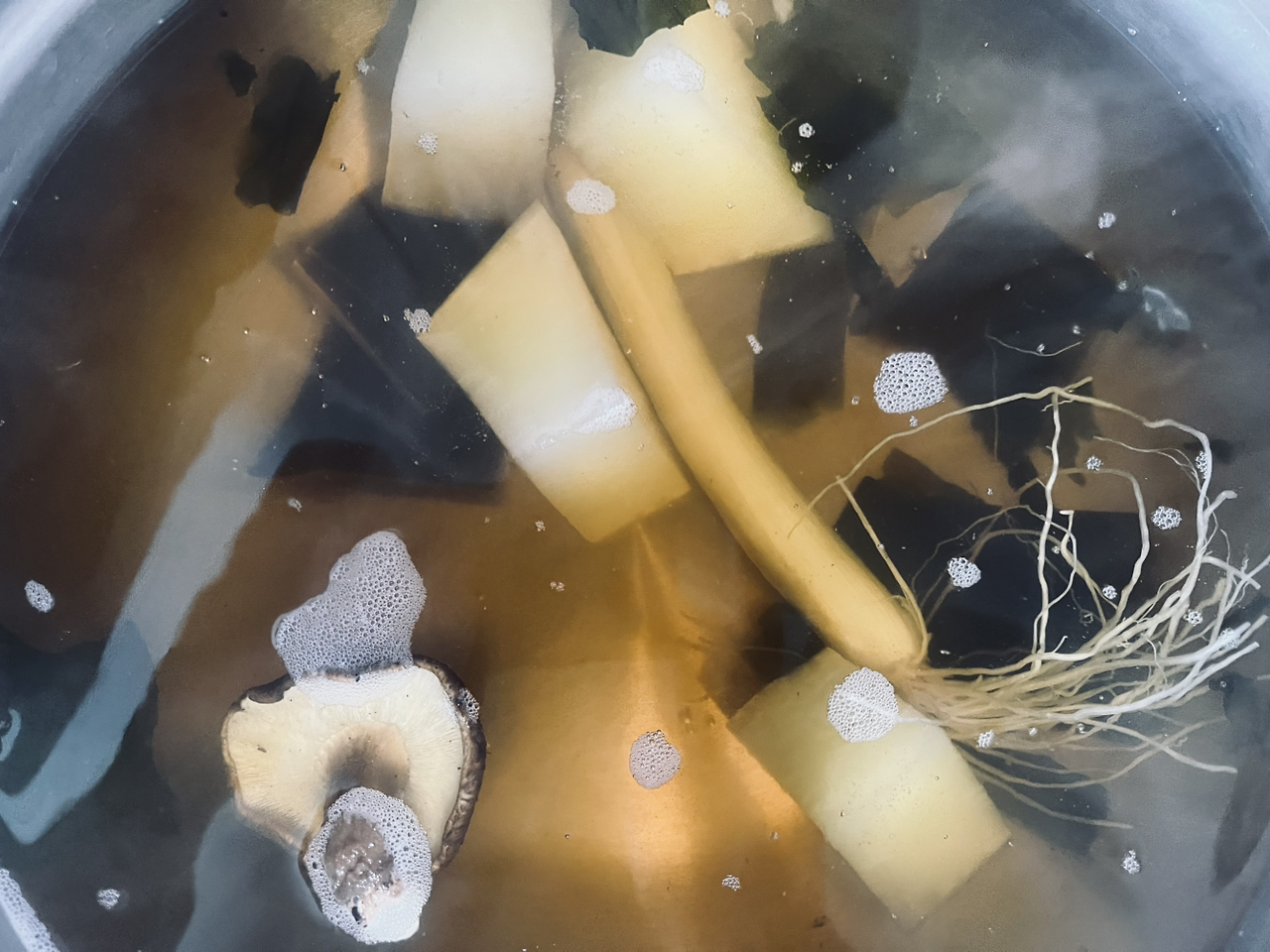 큰 냄비에 무, 파, 표고, 다시마, 미역을 넣고 간장을 부은 후에 불을 켜서 채소들을 뒤적이며 함께 볶다가 간장이 익으면 물을 붓고 끓입니다.