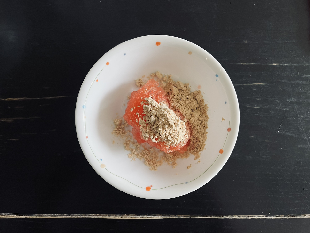 식탁 위, 반으로 나뉘어 비워진 수박껍질들 안에 자작하게 남은 검은 수박씨와 통에 가득 담긴 수박, 유리컵 안 밖에 남은 미숫가루의 흔적들, 그리고 열린 미숫가루 봉다리와 집게, 접시, 포크, 숟가락.