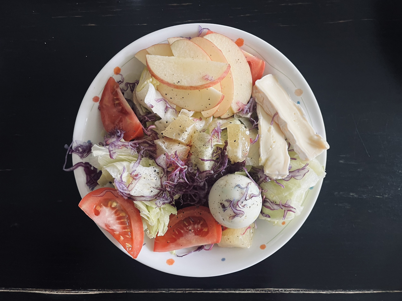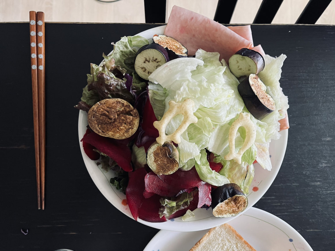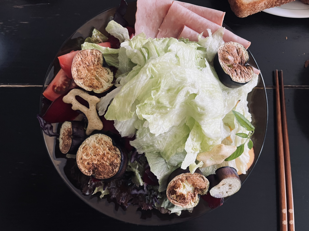 양상추, 상추, 구운 가지, 얇게 벗긴 비트, 적양배추채, 슬라이스햄, 토마토, 천도복숭아, 올리브오일 그리고 대왕고래밥, 요거트를 부어 먹음.