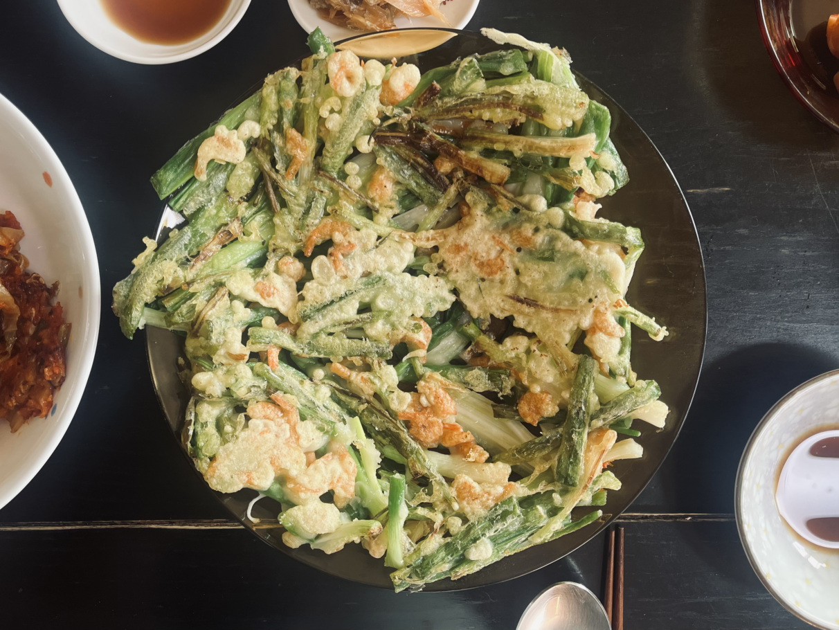 묽은 밀가루 반죽에 소금 간을 약간 한다, 건새우와 자른 쪽파를 듬뿍 넣고 뜨겁게 달군 팬에 올리브오일을 두르고 구웠다. r이 어제 저녁부터 먹고 싶어하던 해물파전을 j가 바삭하게 구워냄. 김치전 한 장과 파전 두장을 놓고 먹은 저녁식사 그리고 어제의 보리굴비와 보리차.