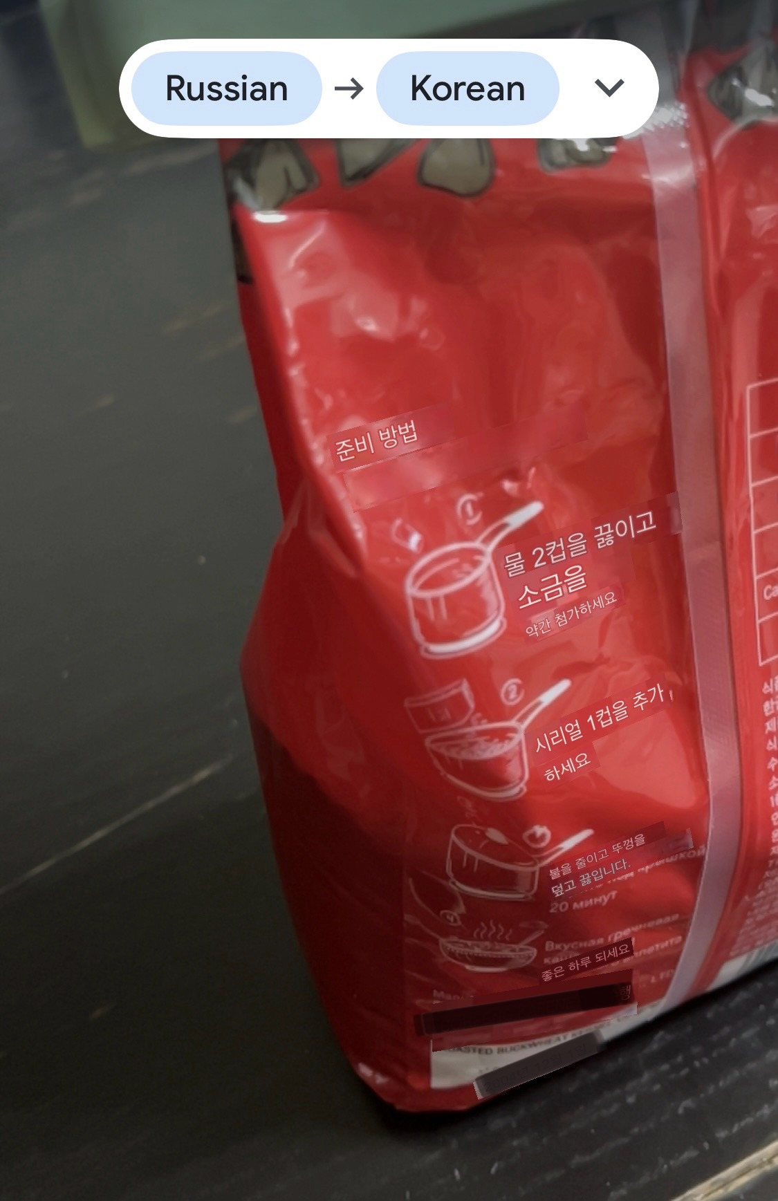 그러다가 가끔 가는 마트에서 보았던 볶은 메밀이 (원산지는 중국산이었음) 생김은 다르지만 같은 방식으로, 차로 간식으로 먹을 수 있지 않을까 해서 사 본 것이다. 집으로 와서 한 숟가락 털어 넣고 우물거린다. 음, 파삭하지 않고 약간 쫀쫀하면서 단단하다. 처음에는 잘 부서지지도 않다가 씹다 보면 어느 순간 사르르 녹는다. 산뜩한 메밀향이 감도는데 전에 샀던 국내산과는 다른 맛이다. 이건 조금 다르네. 봉지 뒤에 적힌 요리법을 보니 러시아어로 적혀있지만, 기본은 냄비에 넣고 20분간(숫자로 써짐) 끓이라는 것을 알 수 있다. ‘간단한데!’