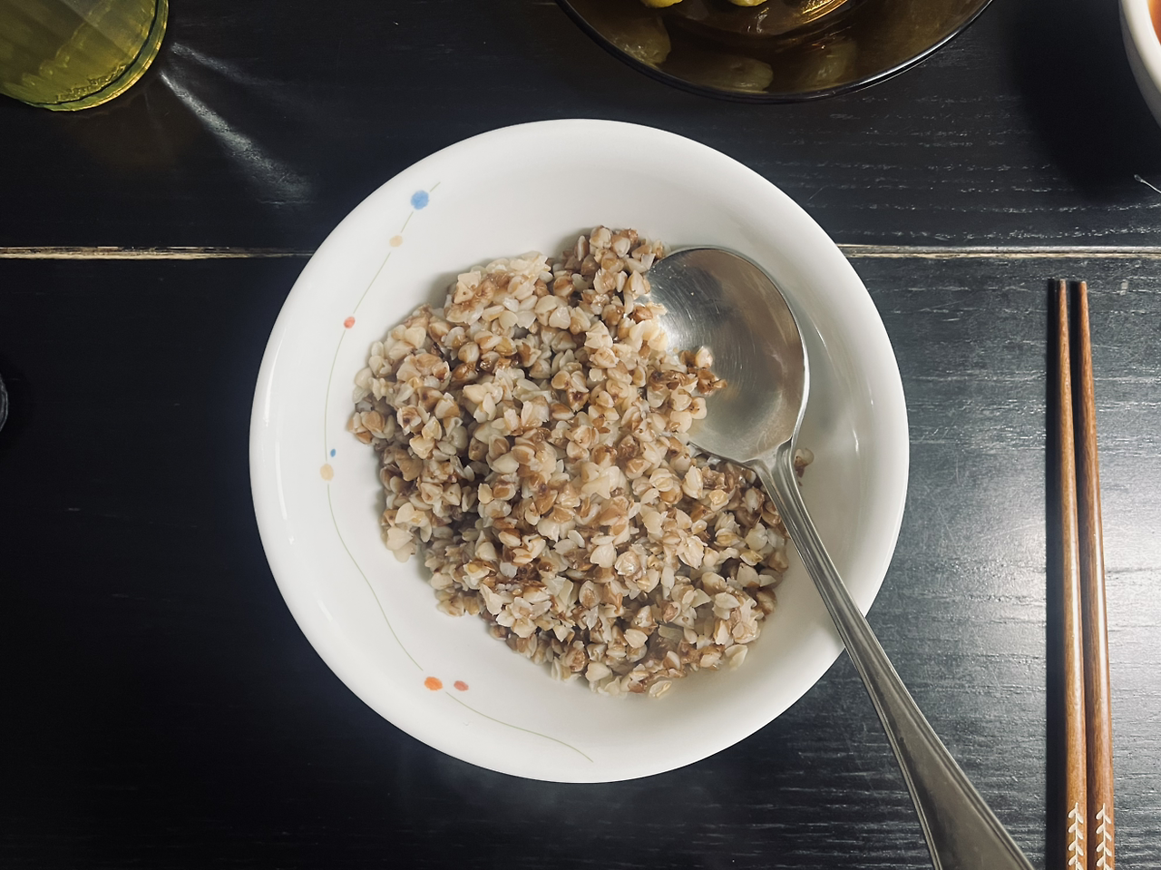 죽이라고 해서 약간 걸쭉한 모습을 생각하며 20분 기다렸다가 뚜껑을 열면 깜짝 놀라고 만다. 포슬포슬하게 불려서 익혀진 메밀이 솥에 가득 차있다. 죽이라고 분명히 번역되었는데, ‘죽’의 범위가 우리와 다른 것 같다. 죽이라기보다는 밥에 가깝다. 3인분 생각해서 메밀 300g을 담고 물 600ml를 넣었는데 900cm³의 메밀죽을 얻었다. 차게 해서 올리브오일을 뿌려 샐러드처럼 먹어도 좋겠다는 생각이 든다. 한 그릇 떠서 오이피클과 먹어보았는데 약간 오트밀 먹는 것과 비슷한데 쌉싸름한 메밀 맛이 있으니까 먹기 좋고 깔끔하다. 건강한 요리라는 것을 알겠다.