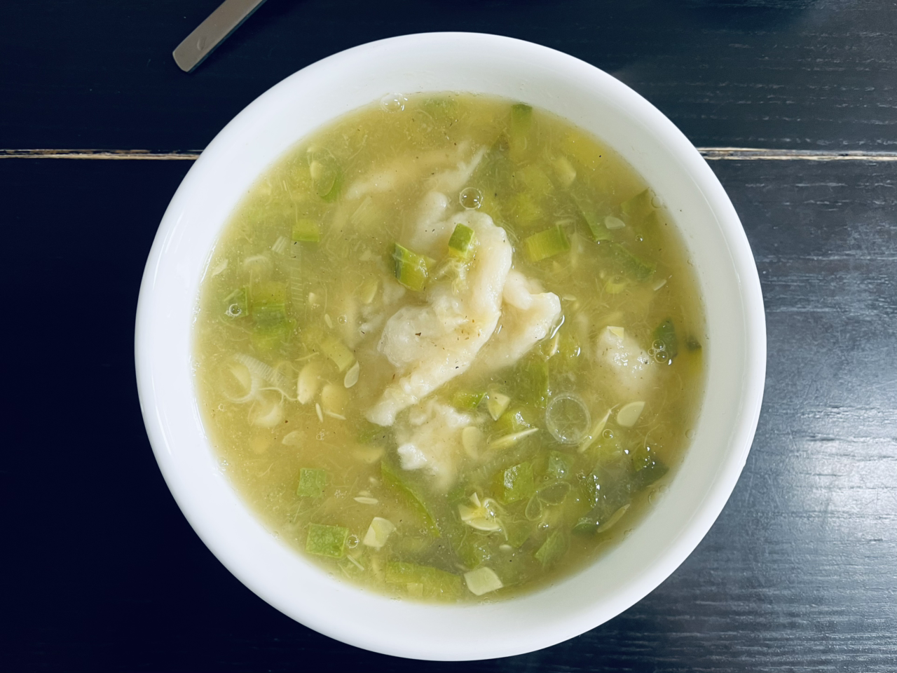 멸치를 볶아서 파뿌리 두 줄기를 넣고 육수를 냅니다. 그 사이 밀가루를 호떡 반죽같이 묽게 해서 냉장고에 넣어둡니다. 호박을 채 썰어둡니다. 남은 파도 채 썰어둡니다. 멸치가 충분히 우러나면 파뿌리와 함께 건지고 호박을 넣습니다. 육수가 다시 끓기 시작하면 손끝에 물을 묻혀가면서 묽은 수제비 반죽을 늘어트리며 떼어냅니다. 남은 파채를 넣고 충분히 끓여서 담습니다.