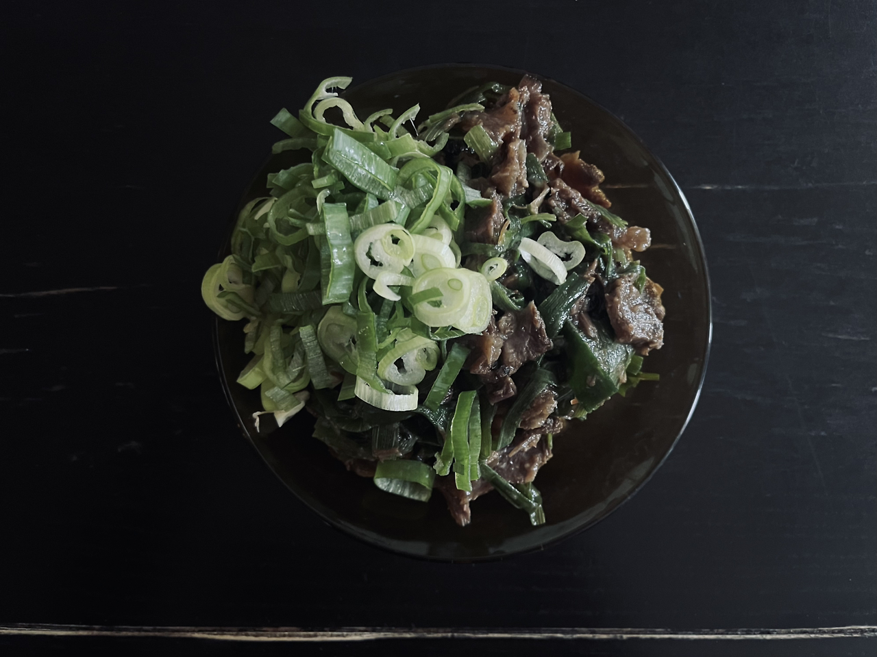 얼마 전에 사태로 만들어 놓은 장조림입니다. 고기 한 근에 통양파 세 개, 간장 반 컵, 맛 술 약간, 후추, 물 1리터 정도를 넣고 오래 끓였습니다. 몇 번 냉장고에서 꺼내 차게도 잘 먹었는데 남은 양이 잘 줄어들지 않고 지루해지는 것 같습니다, 맛이 없었던 걸까요? 솔직하게 말할까 봐 물어보지는 않았습니다. 더 얇게 썰고 약간 데워서 식탁에 놓기로 합니다. 양파를 썰어 넣고 볶는 걸로 시작했는데 장조림이 녹으면서 적당하게 부드럽고 역시 채소가 들어가니까 맛이 더 좋아졌습니다. 오늘은 파입니다. 파가 많아서 넣은 것은 절대 아닙니다. 파를 길게 채 썰고 같이 볶았는데 파가 숨 죽은 모습을 보니 날도 더운데 안 되겠다 싶어서 생파를 얹어서 같이 먹었습니다. 역시 기운을 북돋기 위해서 여름 식사에는 생기가 필요한 것 같습니다. 장조림을 고기 볶음으로, 대 파도.