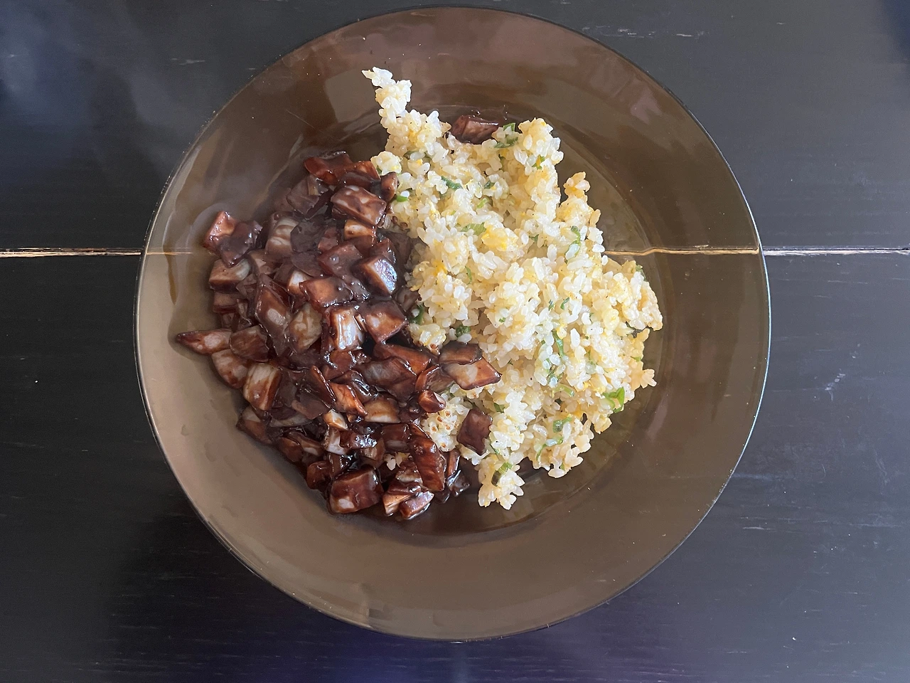 채 썬 파를 마른 팬에 볶다가 기름을 넣고 볶고, 고슬고슬하게 지은 밥을 넣고 볶고, 계란을 풀어서 볶고 소금, 후추 간을 해서 볶아 담고, 다진 양파를 볶고, 멸치액젓도 약간 넣어 볶고, 춘장에 기름도 넣고 볶아서 담았습니다. 여덟 번 볶았습니다.