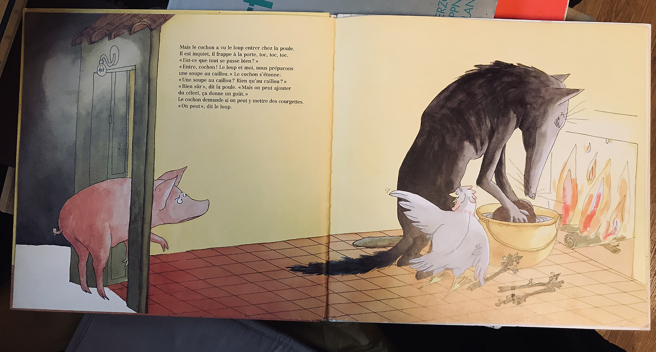 돌 수프를 준비하는 늑대에게 닭이 말한다.