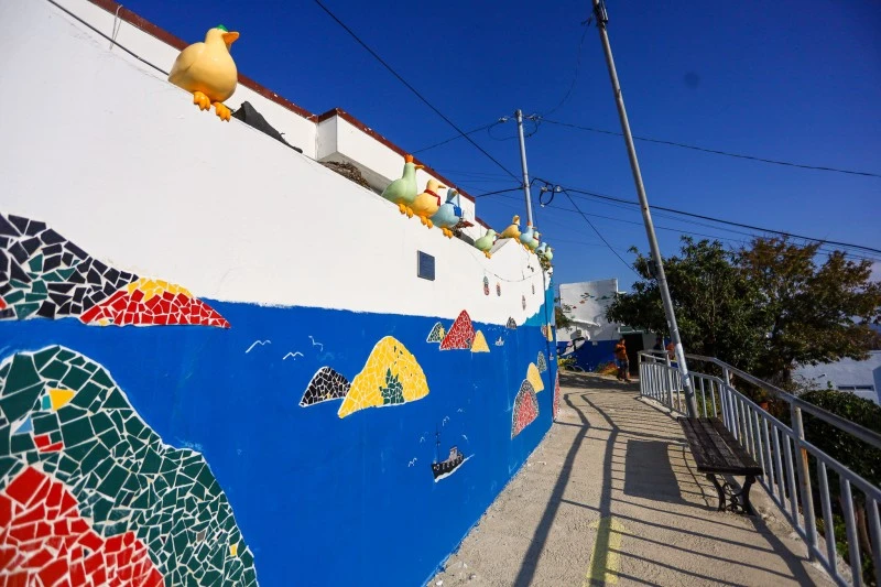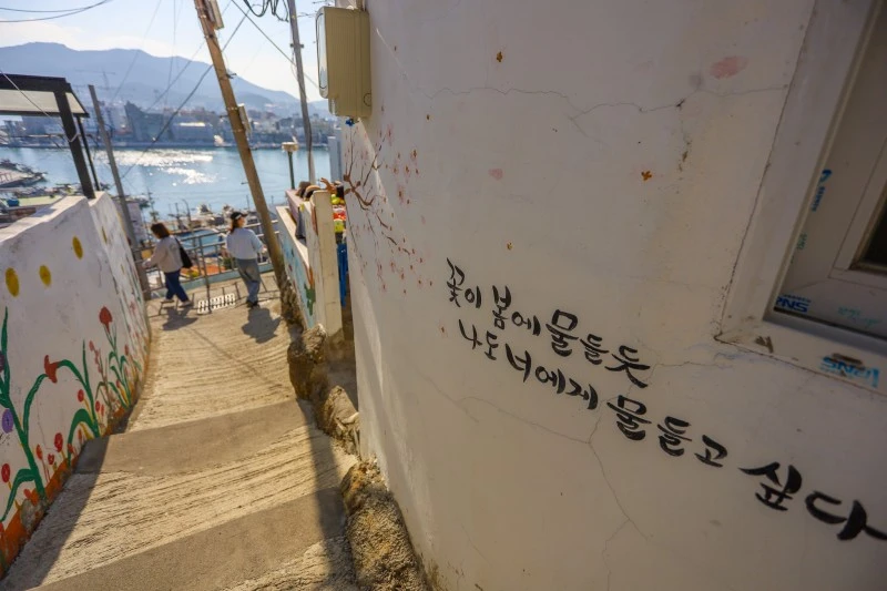 골목을 나와 5분 정도 걸으면 높다란 언덕 위에 동피랑이 나타납니다. 동피랑은 동쪽벼랑이라는 뜻의 통영 사투리랍니다. 지그재그로 이어진 좁은 골목을 따라 알록달록 벽화들이 가득합니다.