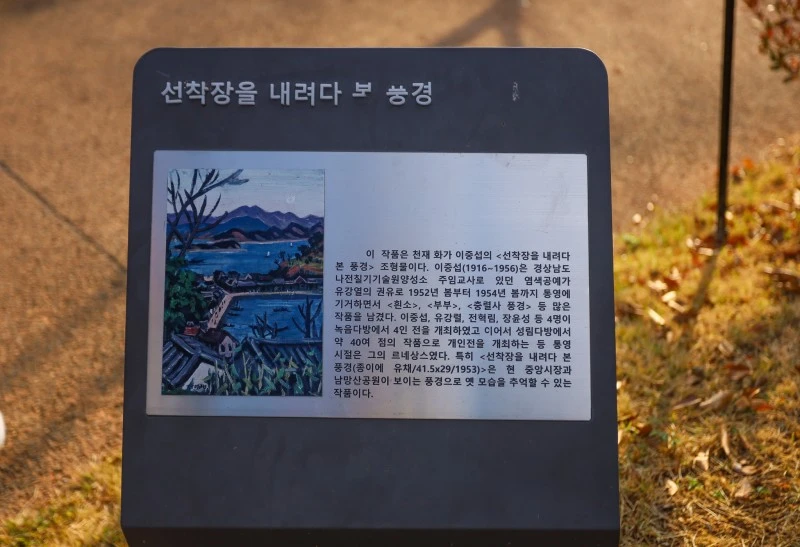천재화가 이중섭도 이곳에서 그림을 남겼습니다. <선착장을 내려다 본 풍경>을 바로 여기 앉아 그렸다고 해요. 이중섭이 그림으로 남겼던 바다를 감상하며 잠시 쉬었습니다. 이중섭은 1952년 봄부터 1954년 봄까지 통영에 머물렀는데, 수많은 작품을 남기고 전시회를 열었던 이 시기가 그의 생애 르네상스였다고 합니다.