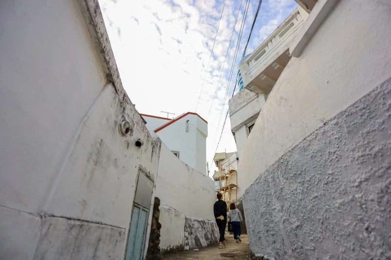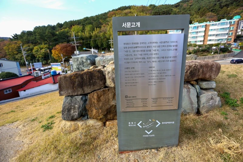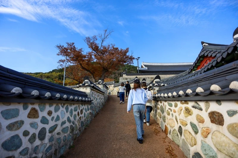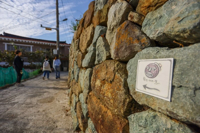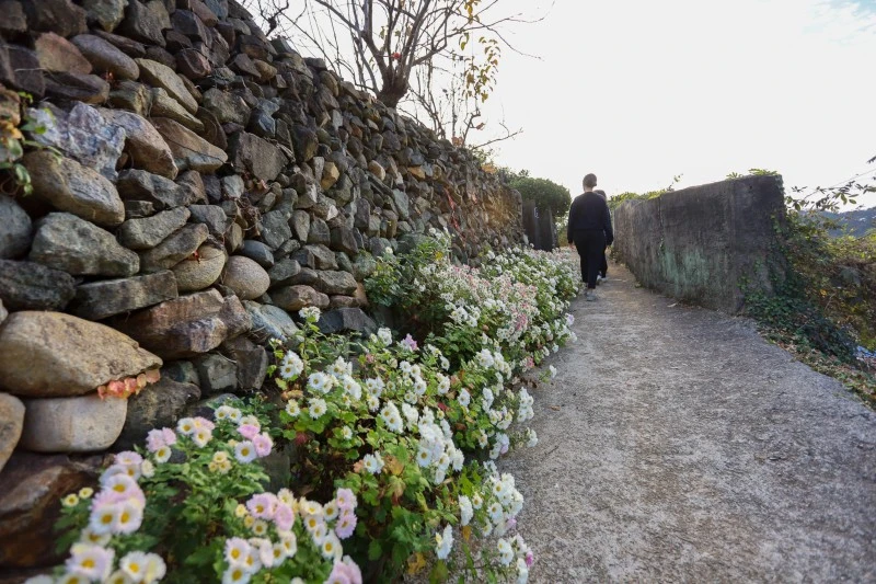 이제 소설 <김약국의 딸들>의 배경이 된 서문고개를 지납니다. 돌담 옆으로 핀 국화가 반겨줍니다. 원래 코스는 곧장 큰길로 이어지지만 박경리 생가로 가기 위해 서문고개를 넘습니다. 서피랑으로 가는 지름길이기도 합니다.