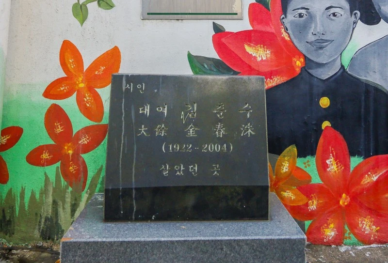 '꽃' 시비가 있는 곳에서 횡단보도를 건너면 좁은 골목안에 그의 생가가 있습니다. 대문 안까지 들어가 볼수는 없지만 담장에 그려진 벽화와 그의 시구가 반갑습니다. 사실 김춘수 생가는 29코스에 포함되지는 않지만 코스를 크게 벗어나지 않아서 들렸습니다.
