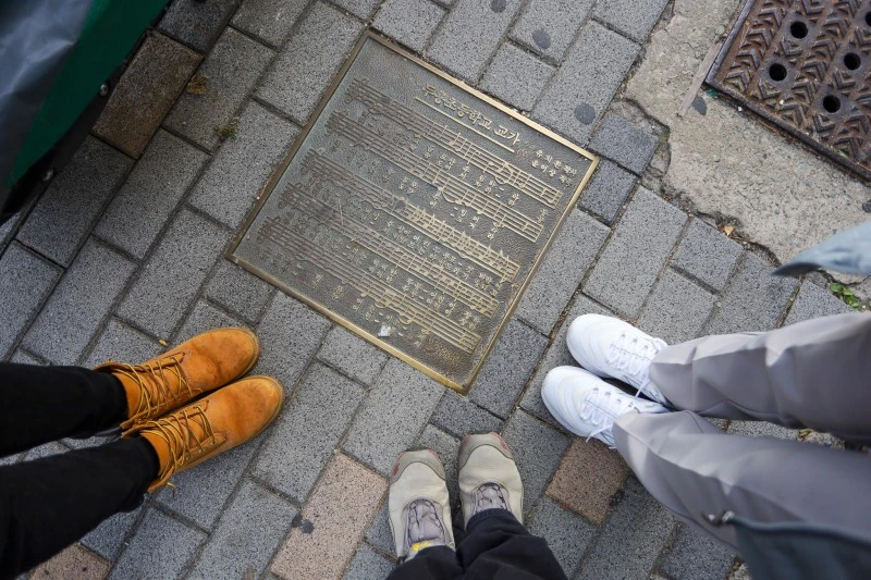 서피랑을 내려오면 길바닥에 악보동판이 보입니다. 윤이상이 작곡한 학교 교가들입니다. 통영 지역 거의 모든 초등학교 교가는 물론 통영고등학교, 통영여중, 부산고등학교, 마산고등학교 심지어 고려대학교 교가까지 그가 작곡한 것으로 유명합니다. 그가 학교 다니던 길을 따라 학교가는 길도 조성되어 있습니다.